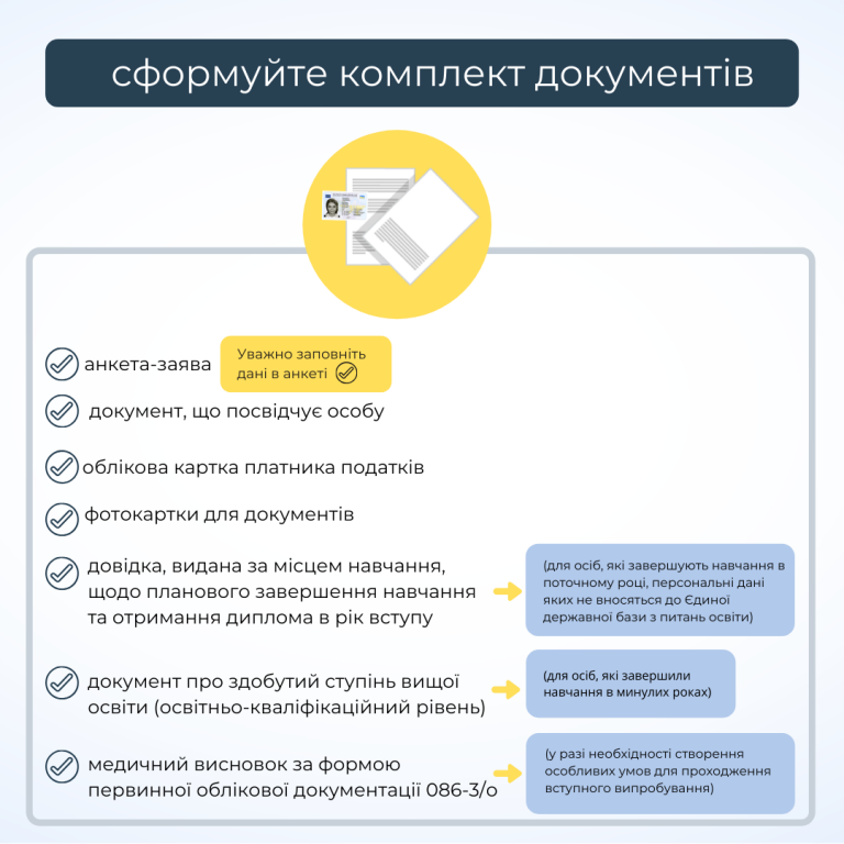 - документа про здобутий ступінь вищої освіти/освітньо-кваліфікаційний рівень (для тих осіб, які завершили навчання в минулих роках);