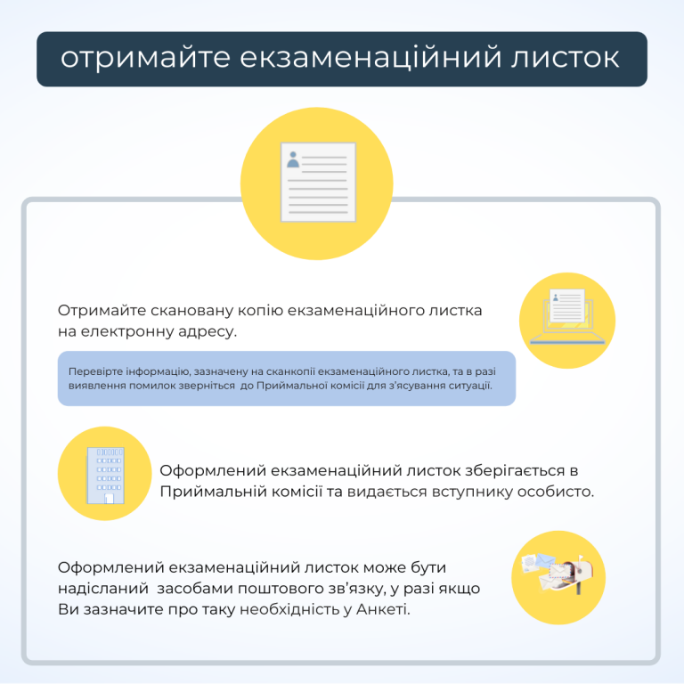- Після перевірки технічними секретарями документів, отриманих від вступника, їх друку, формування особової справи та екзаменаційного листка, сканована копія екзаменаційного листка надсилається вступнику на вказану ним в заяві-анкеті електронну адресу.