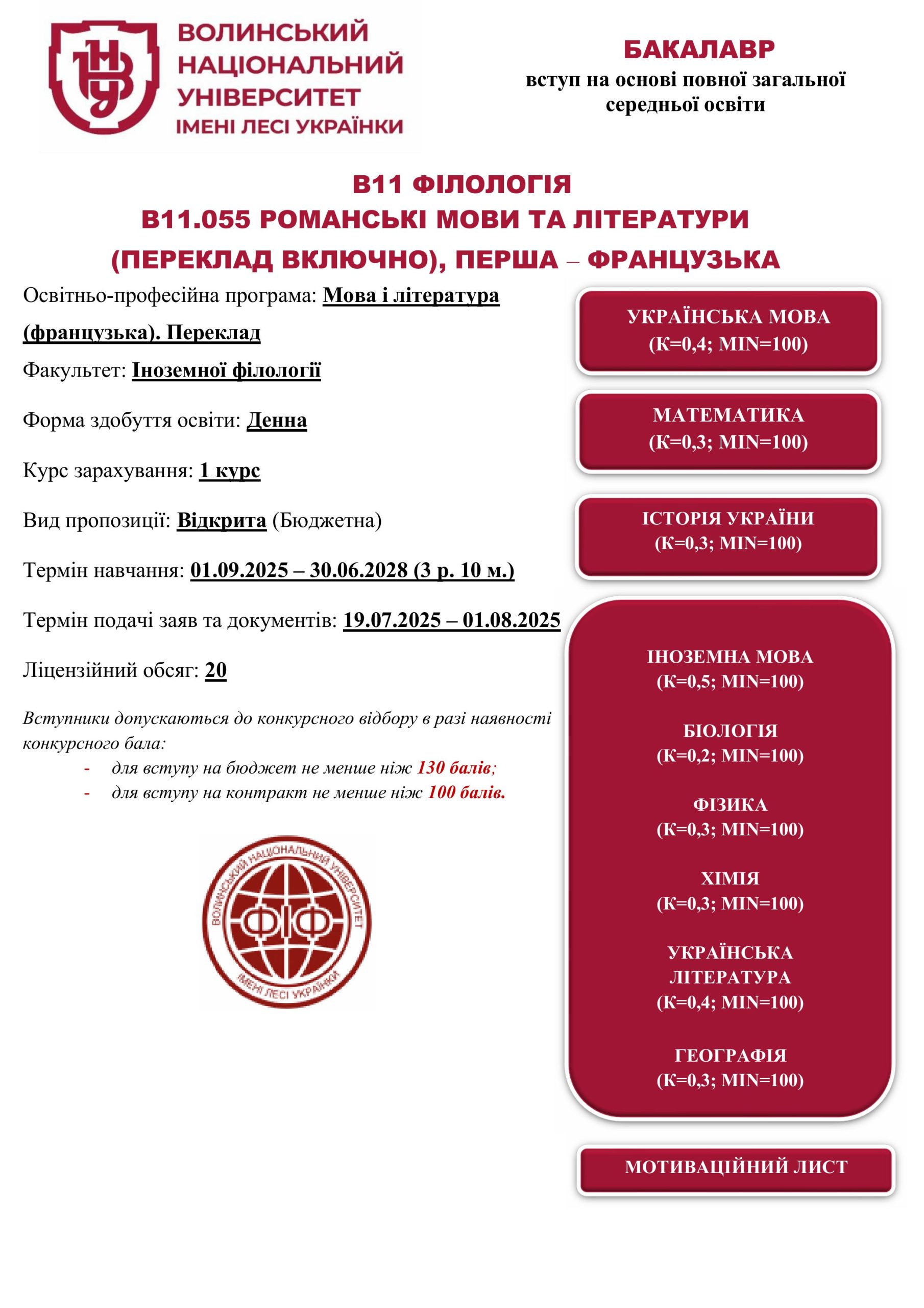 В11.055 Романські мови та літератури (переклад включно), перша ‒ французька/Мова і література (французька). Переклад