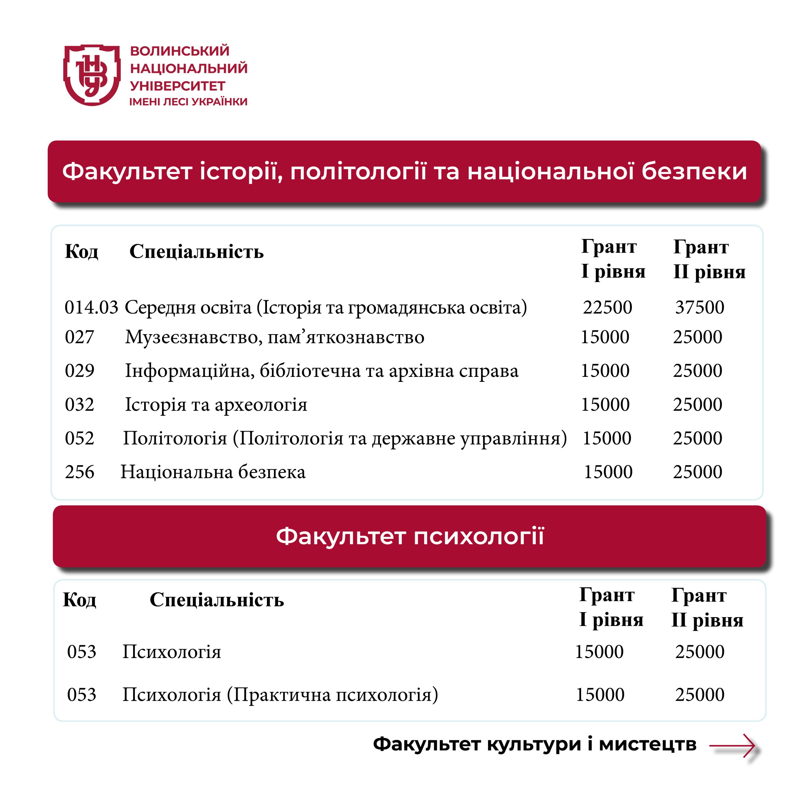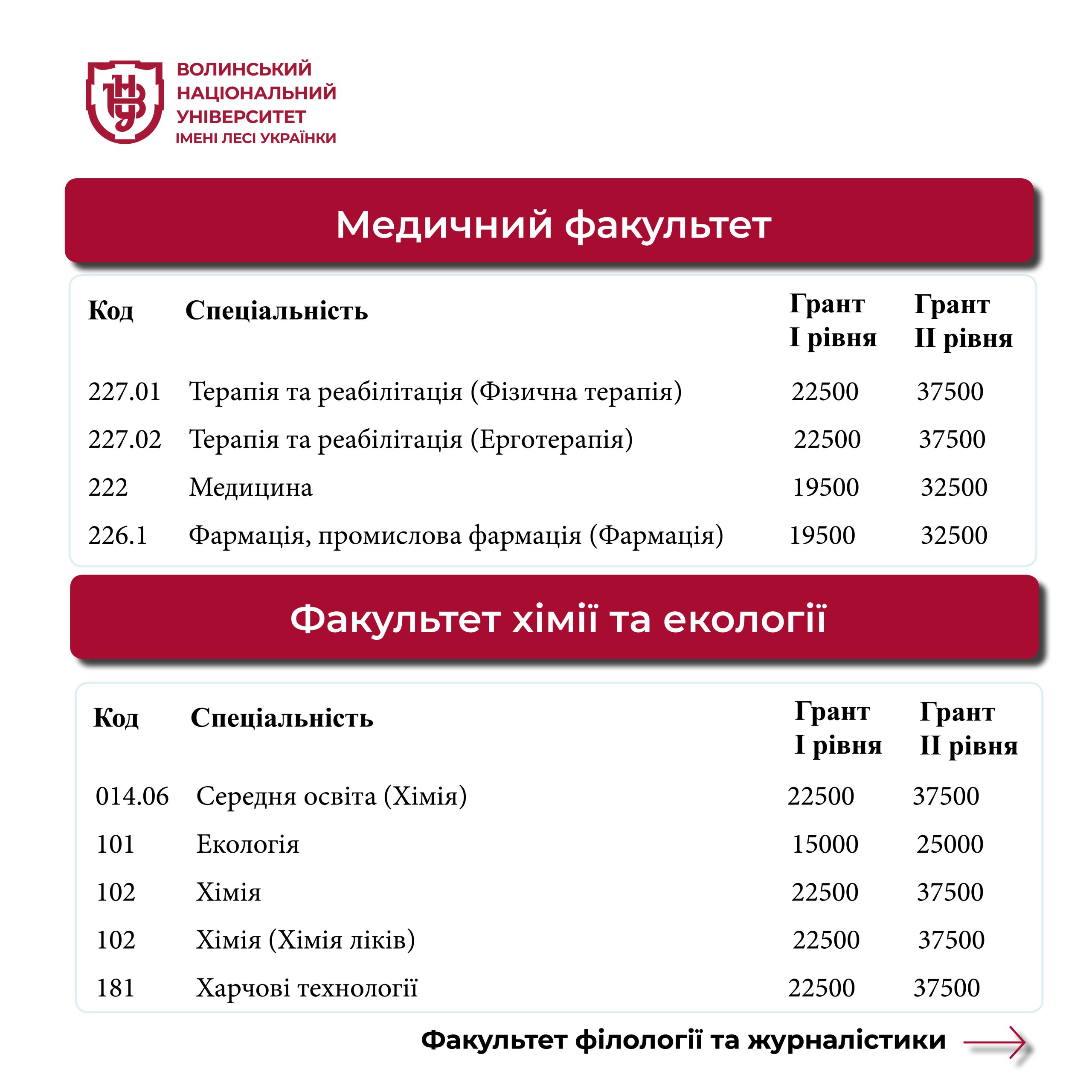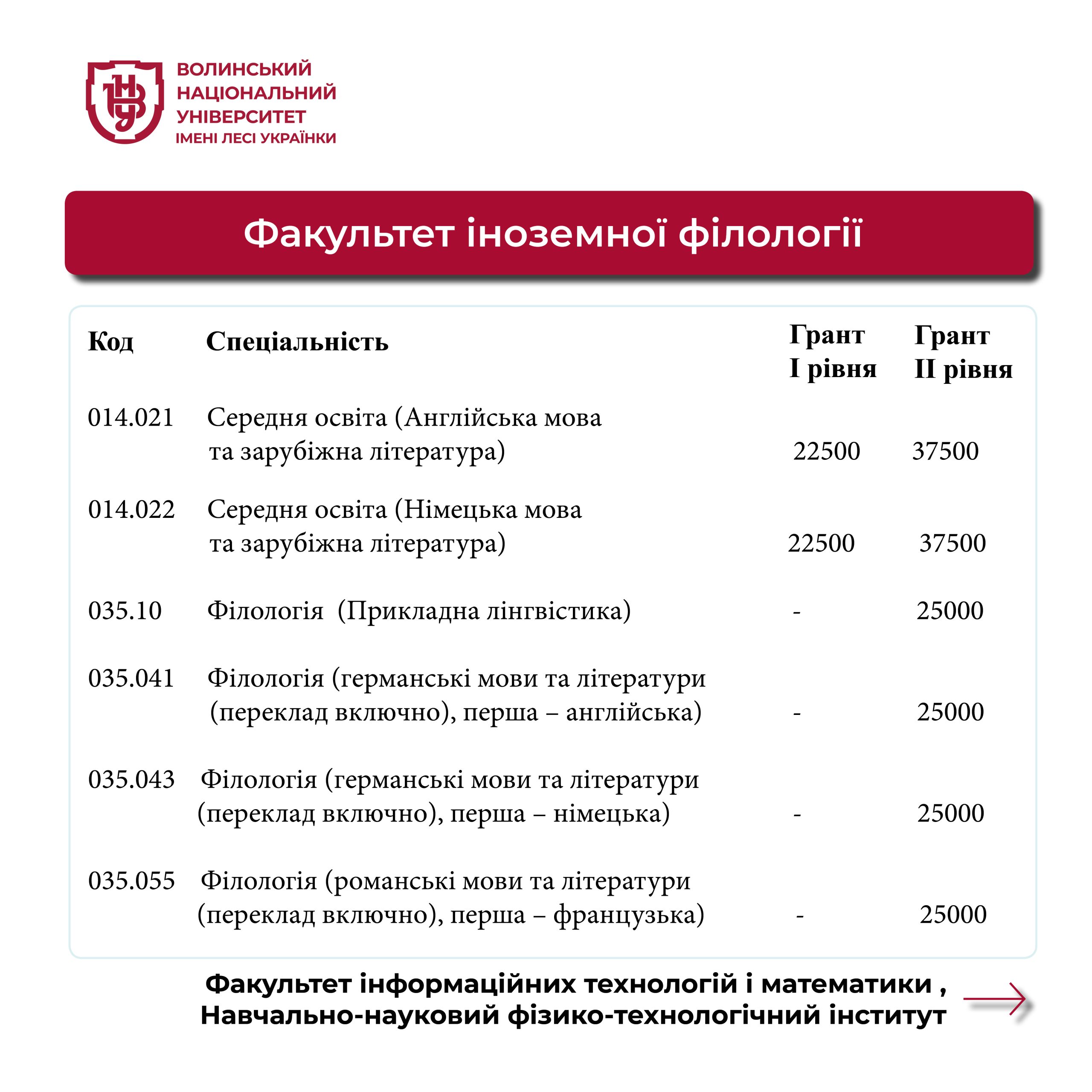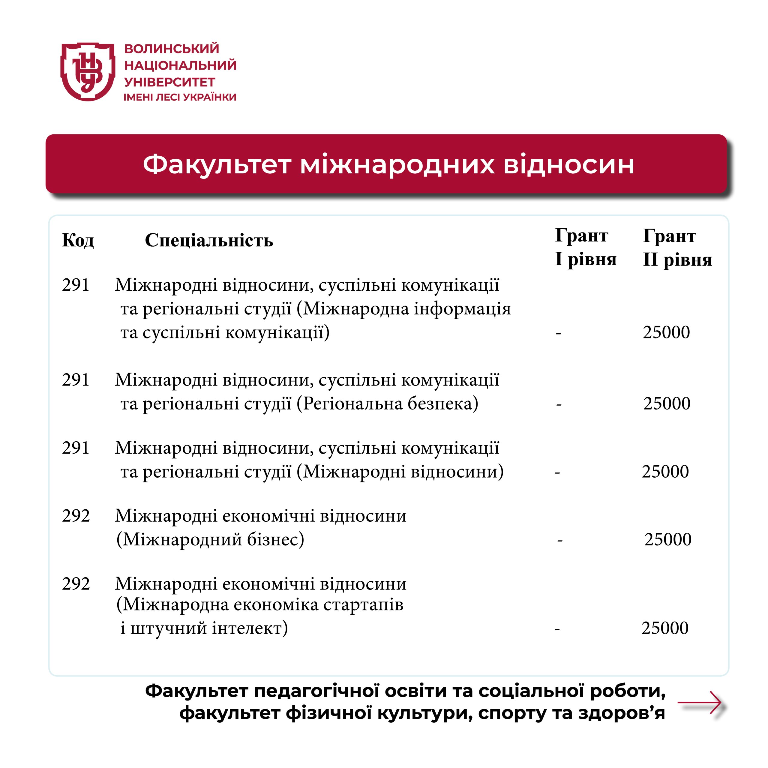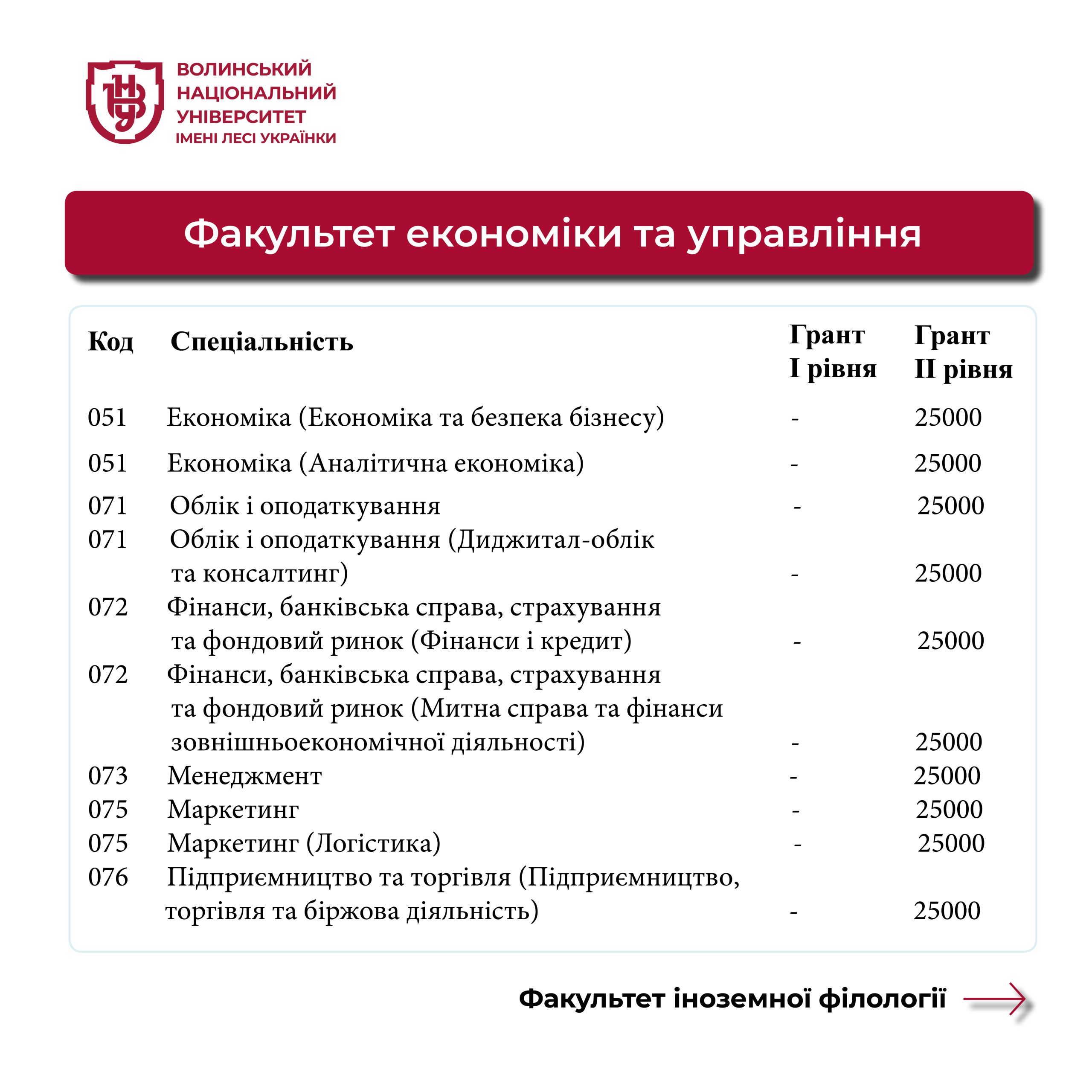 Перелік можливих спеціальностей, на які можна отримати грант у ВНУ імені Лесі Українки та інша важлива інформація