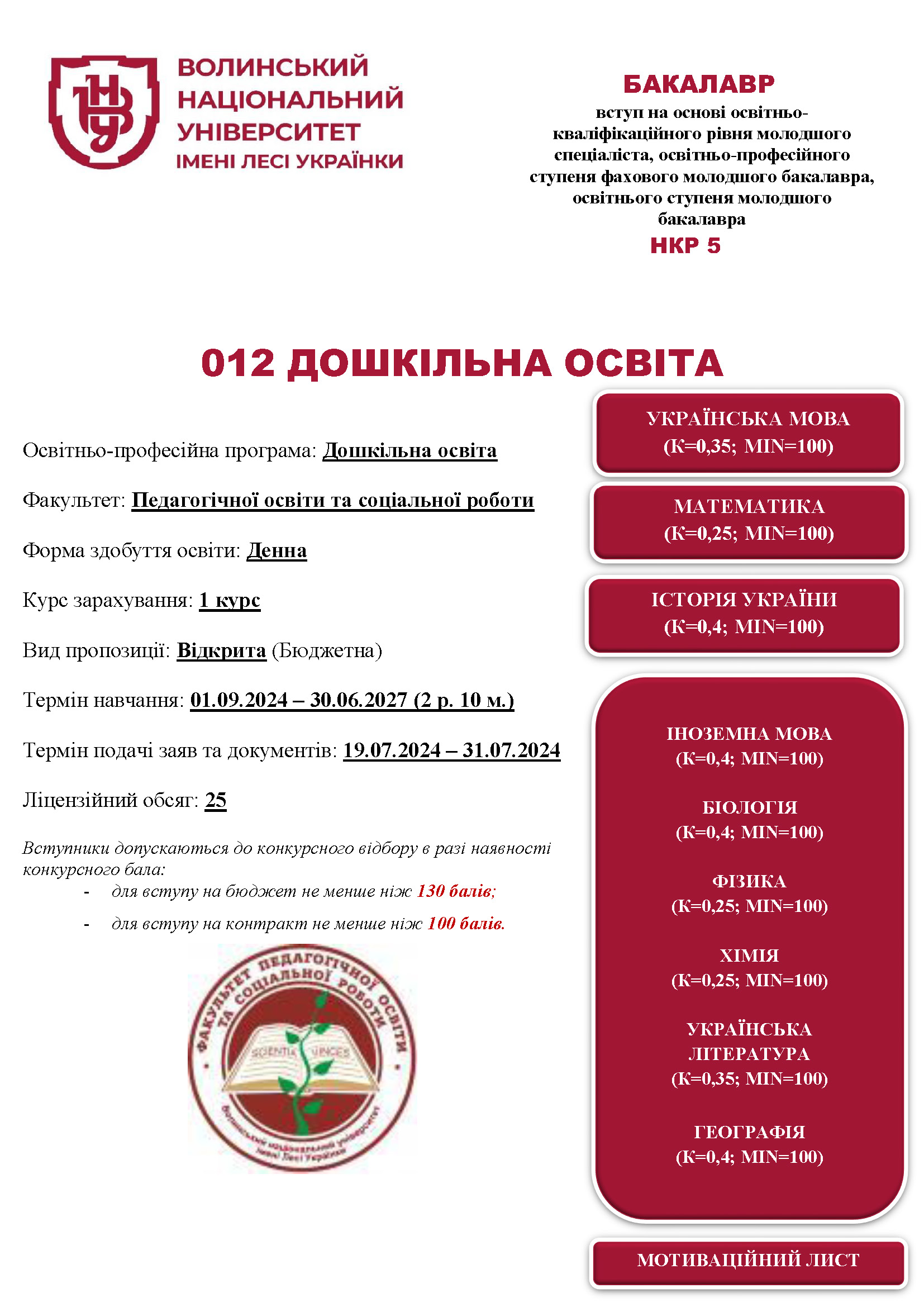 Дошкільна освіта (бюджетна, денна, НКР 5)