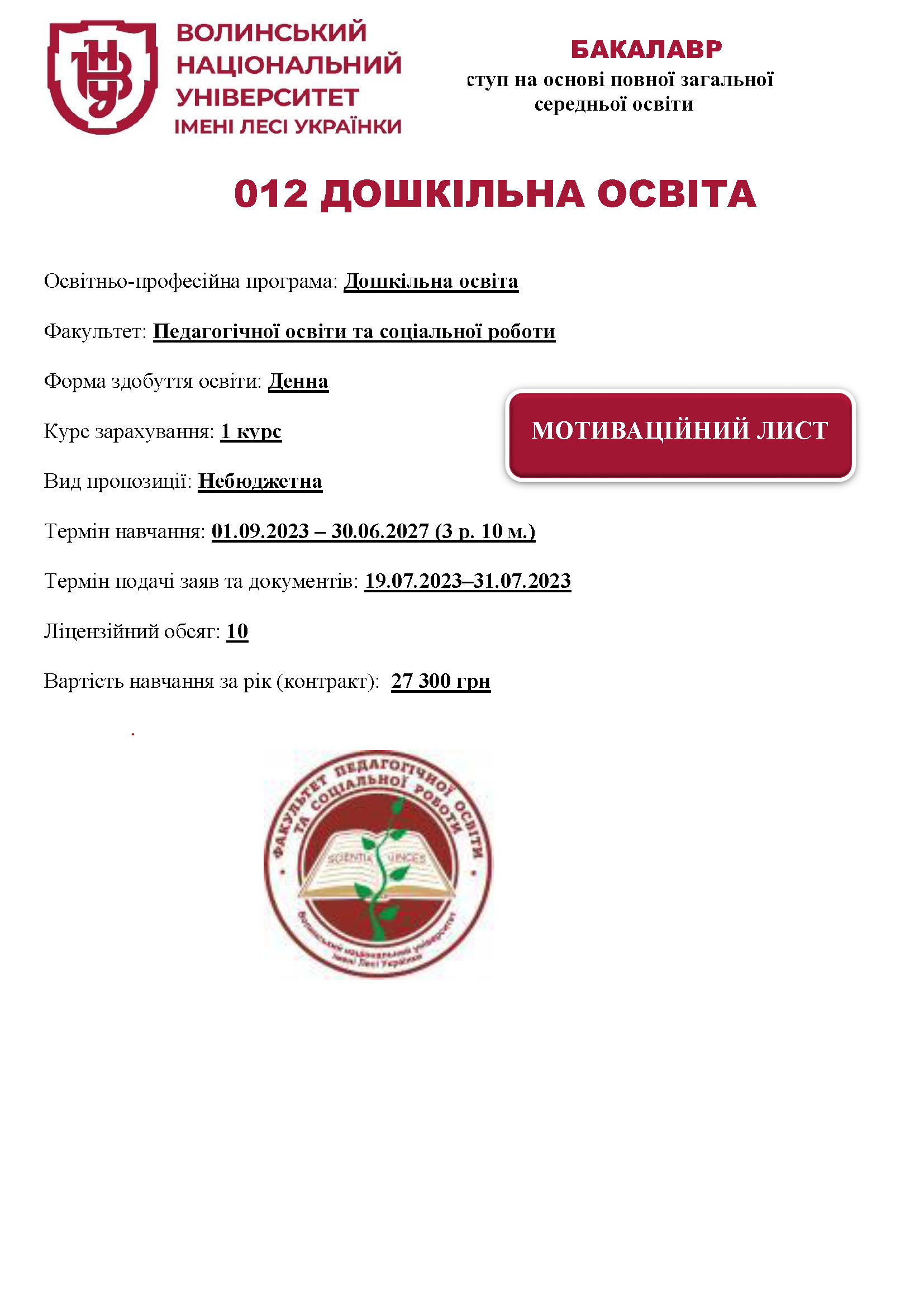 Дошкільна освіта (денна форма здобуття освіти, вид пропозиції: небюджетна) – Приймальна комісія Волинського національного університету імені Лесі Українки