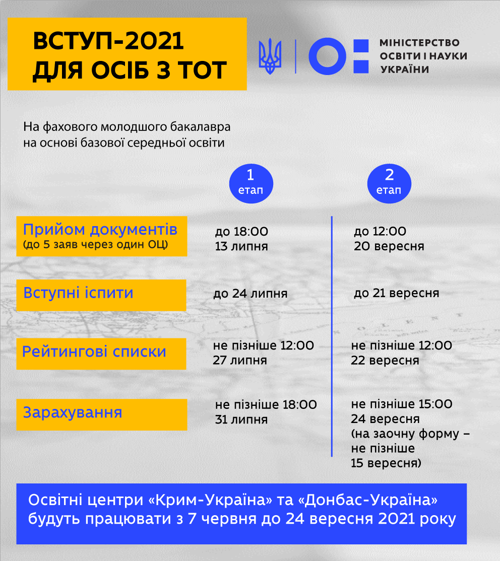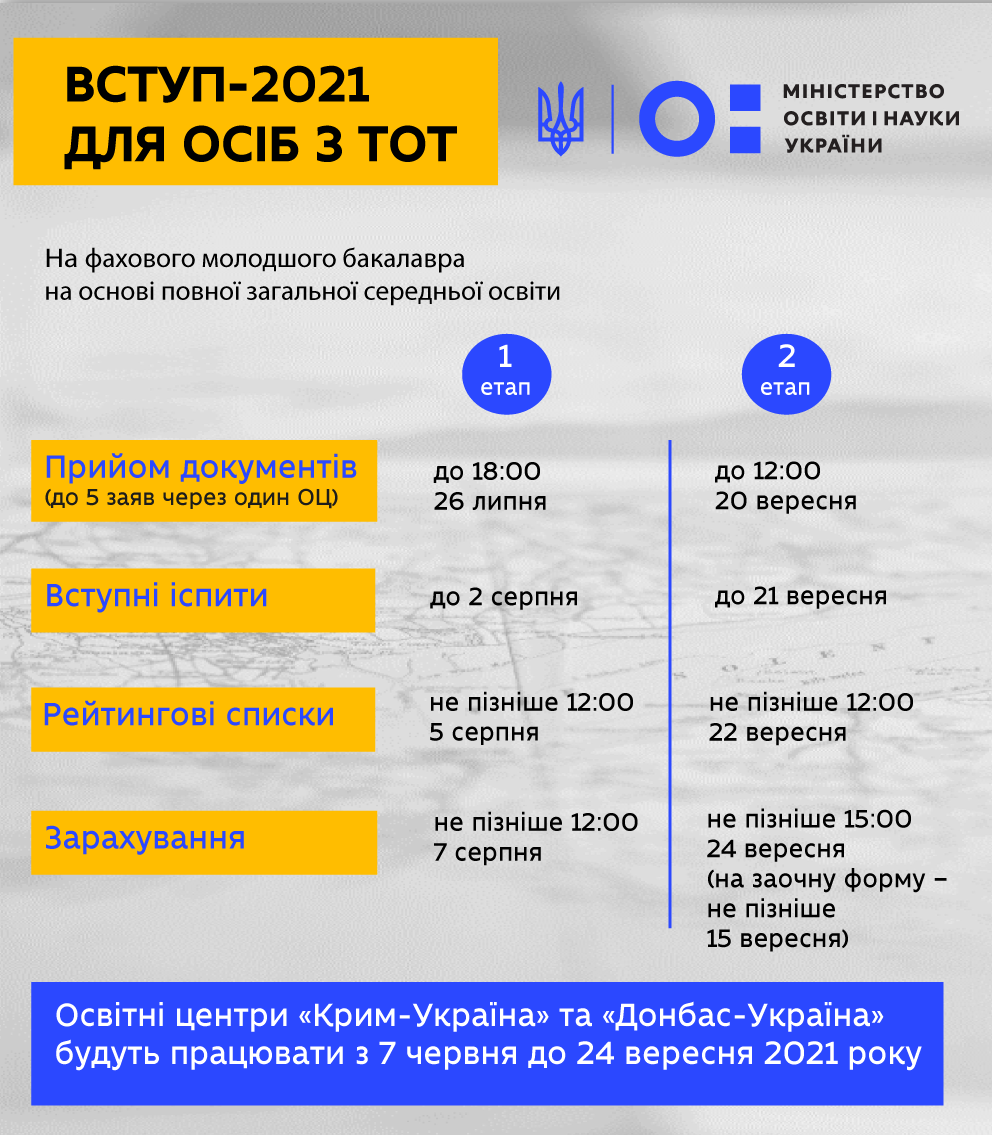 Особи з ТОТ мають право вступати для здобуття освітнього ступеня молодшого бакалавра, бакалавра (магістра медичного, фармацевтичного або ветеринарного спрямувань) на основі повної загальної середньої освіти та для здобуття освітньо-професійного ступеня фахового молодшого бакалавра на основі базової середньої або повної загальної середньої освіти. Також вступники можуть подавати документи на місця, що фінансуються за кошти державного бюджету або за кошти фізичних та юридичних осіб.