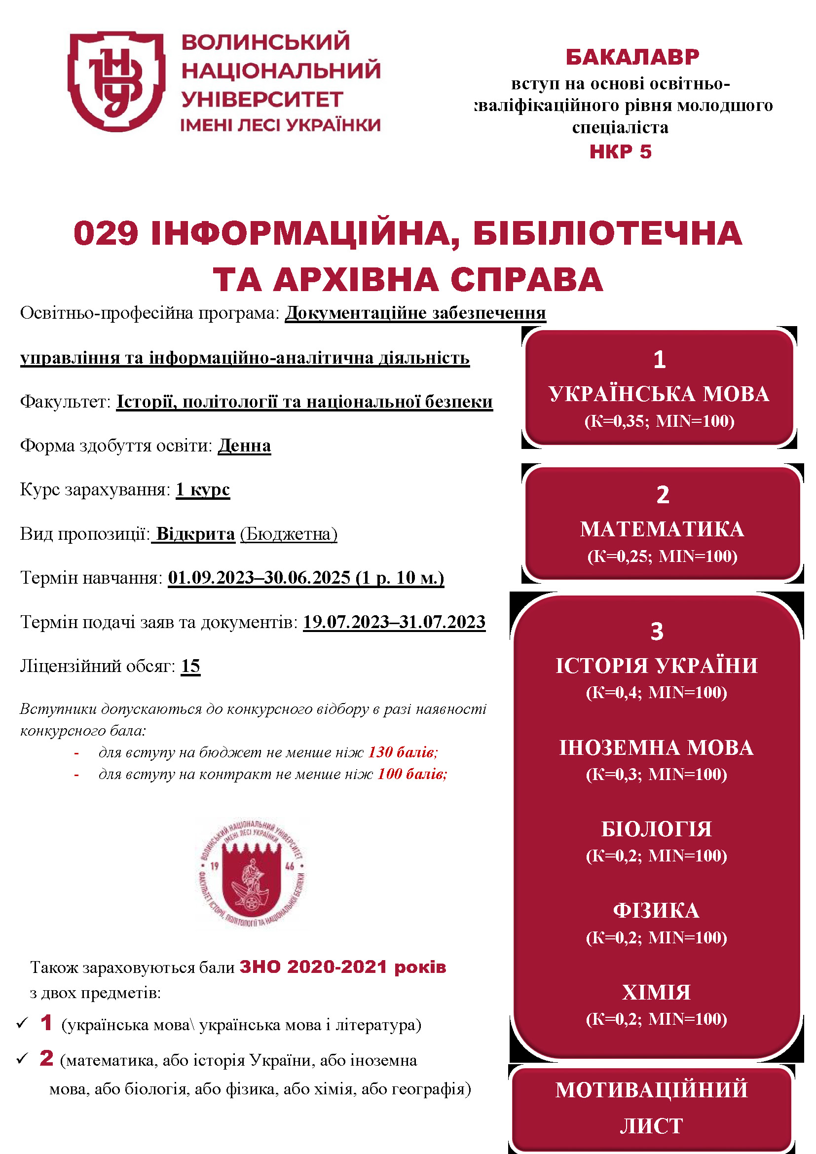 Освітня програма «Документаційне забезпечення управління та інформаційно-аналітична діяльність» (денна форма здобуття освіти, вид пропозиції: відкрита/бюджетна) – Приймальна комісія Волинського національного університету імені Лесі Українки