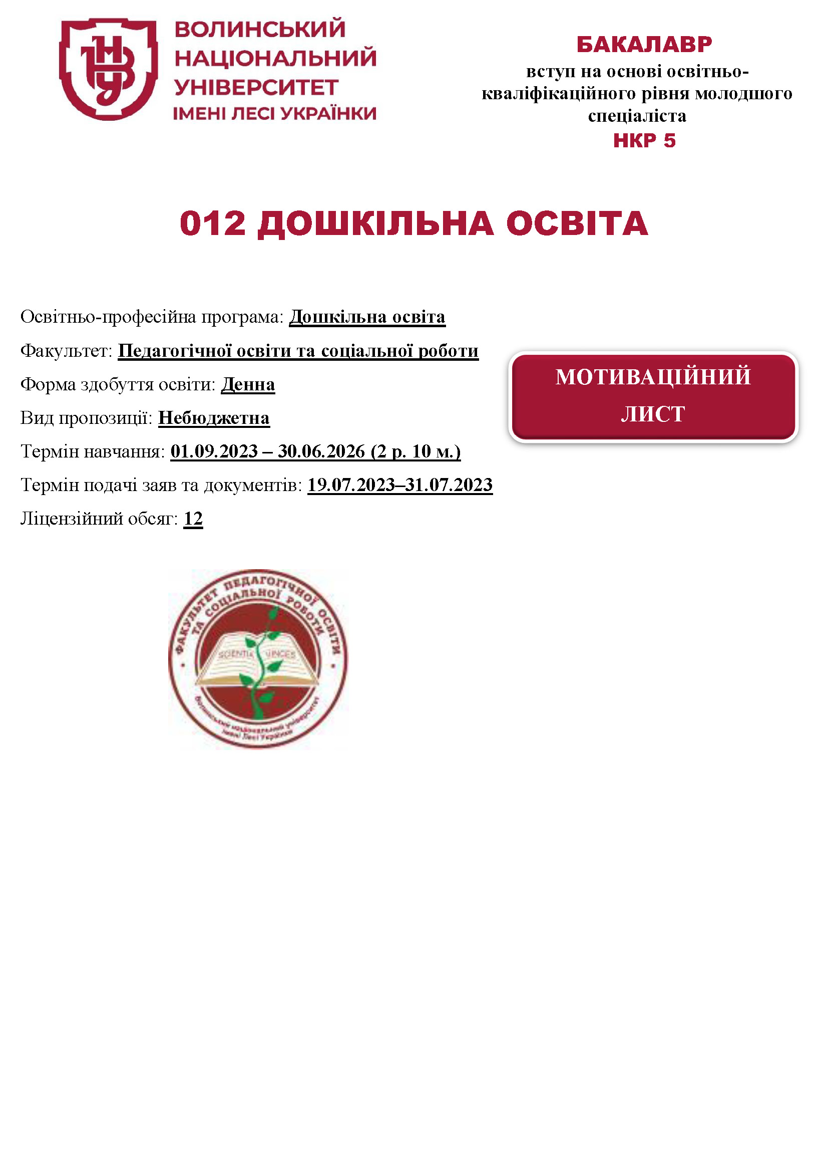 Освітня програма «Дошкільна освіта» (денна форма здобуття освіти, вид пропозиції: небюджетна)