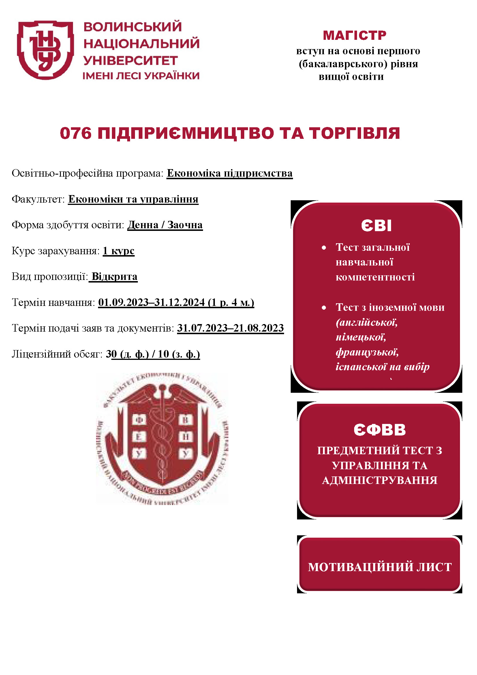 Освітня програма «Економіка підприємства» (М) – Приймальна комісія Волинського національного університету імені Лесі Українки