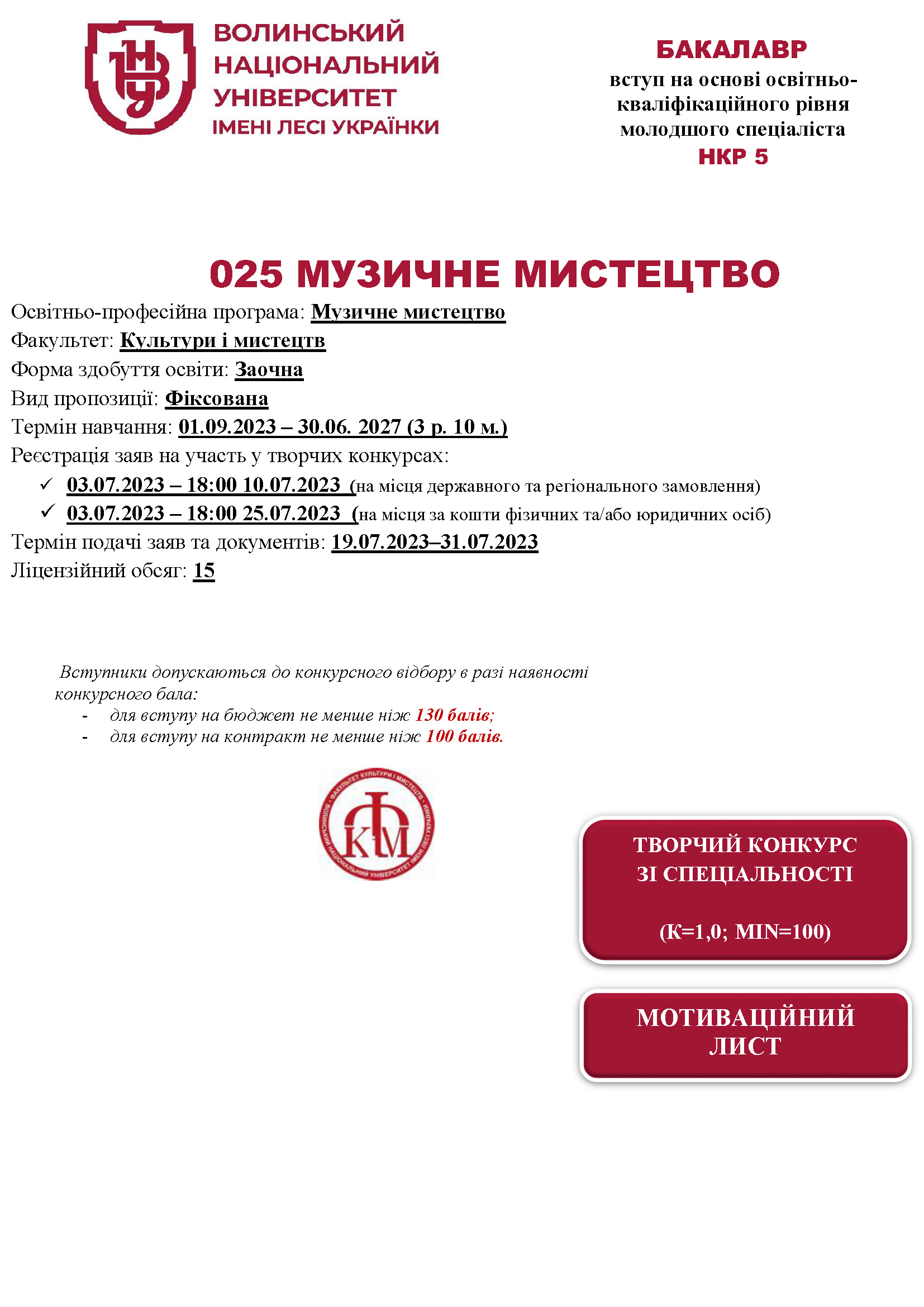 Освітня програма «Музичне мистецтво» (заочна форма здобуття освіти, вид пропозиції: фіксована)