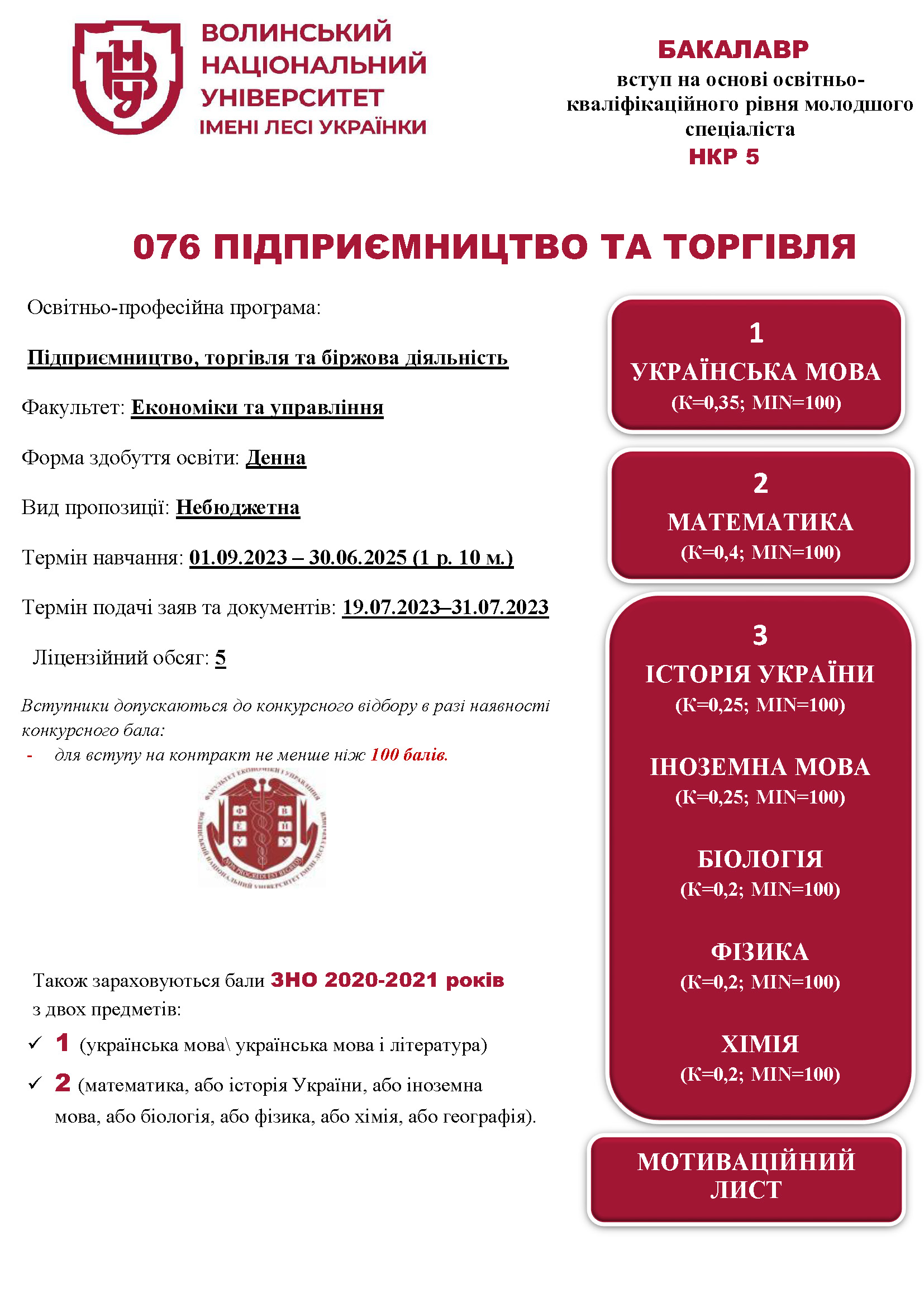 Освітня програма «Підприємництво, торгівля та біржова діяльність» (денна форма здобуття освіти, вид пропозиції: небюджетна, термін навчання: 1 р. 10 м.)