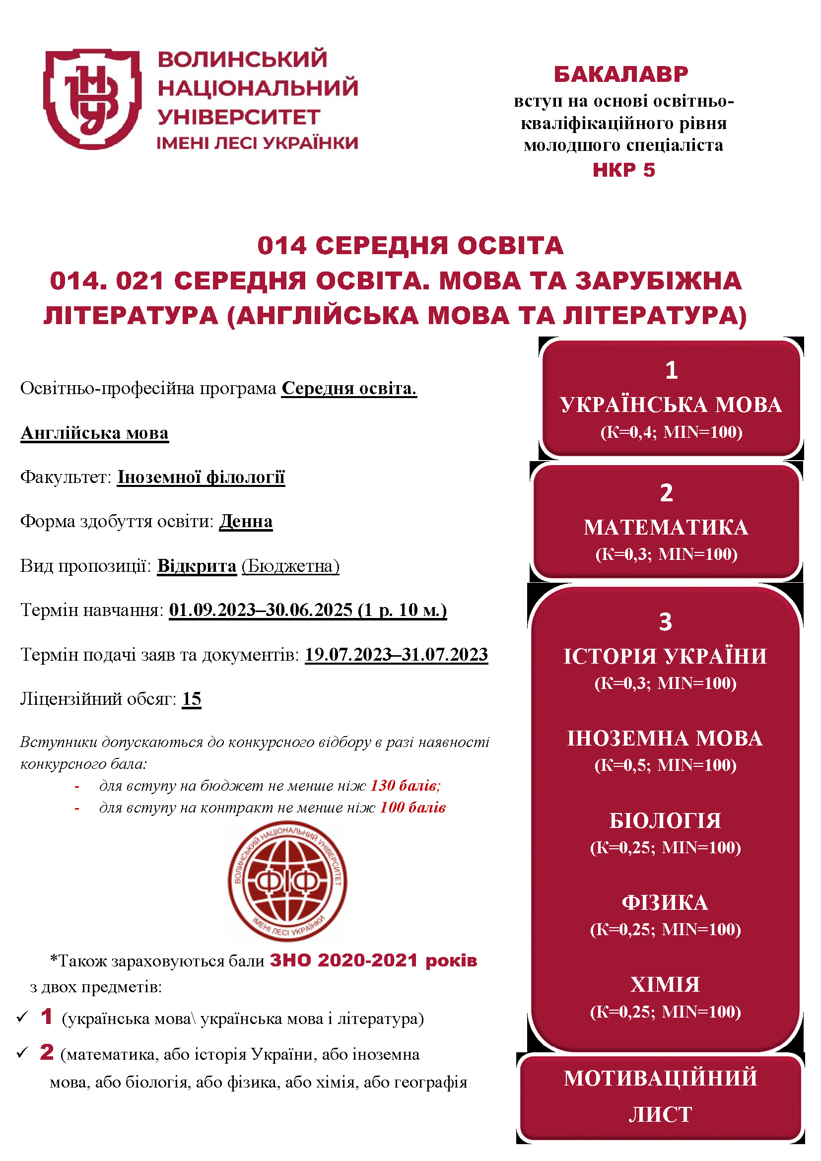 Освітня програма «Середня освіта. Англійська мова» (денна форма здобуття освіти, вид пропозиції: відкрита/бюджетна)