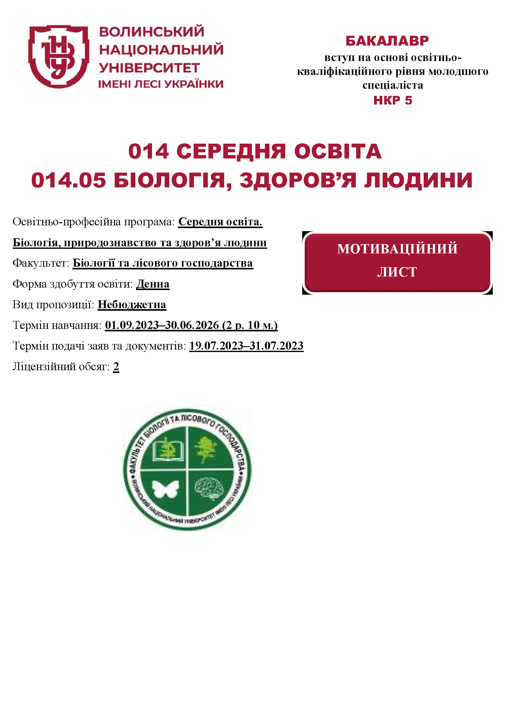 Освітня програма «Середня освіта. Біологія, природознавство, здоров’я людини» (вид пропозиції: закрита/небюджетна)