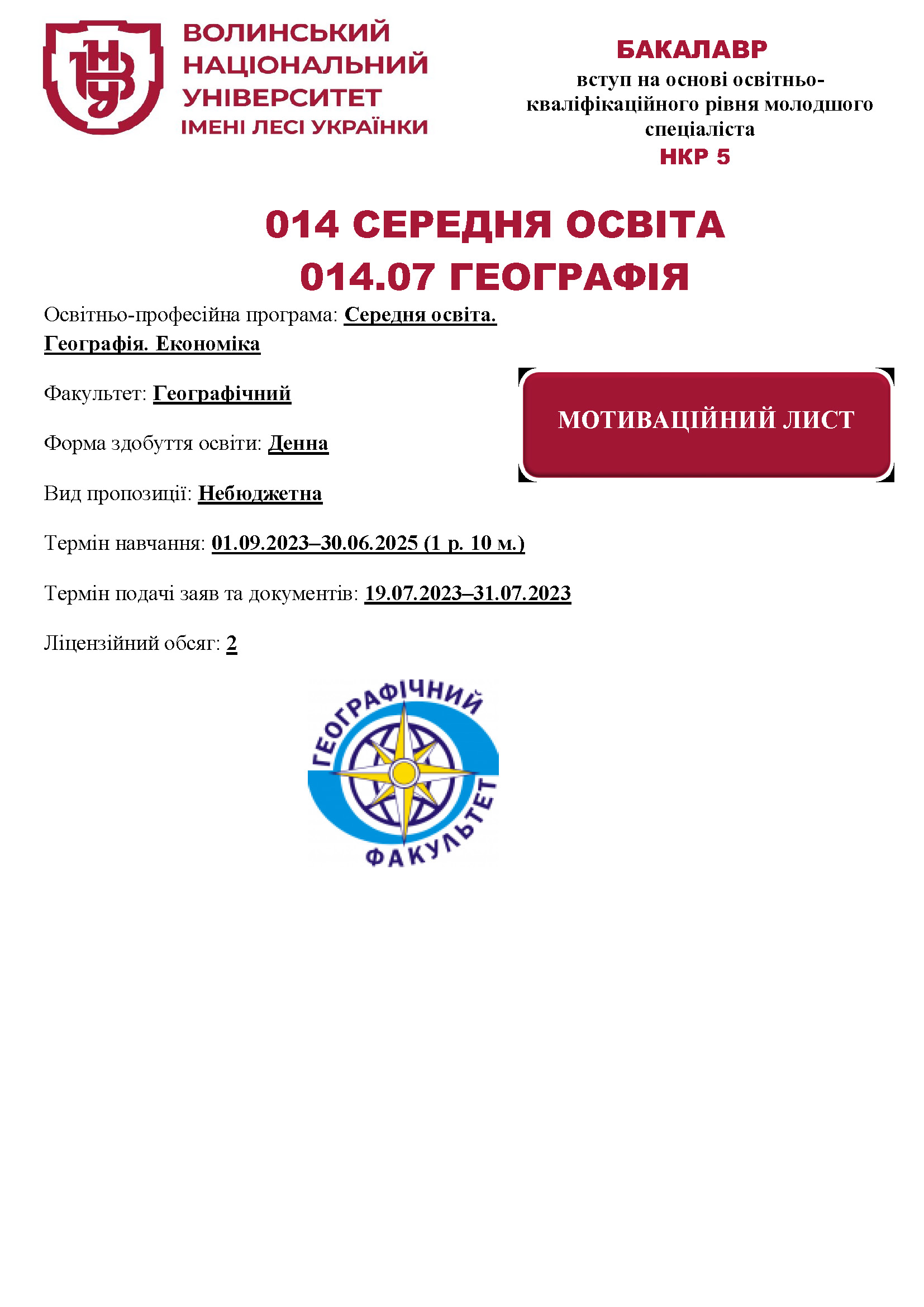 Освітня програма «Середня освіта. Географія. Економіка» (вид пропозиції: закрита/небюджетна) – Приймальна комісія Волинського національного університету імені Лесі Українки