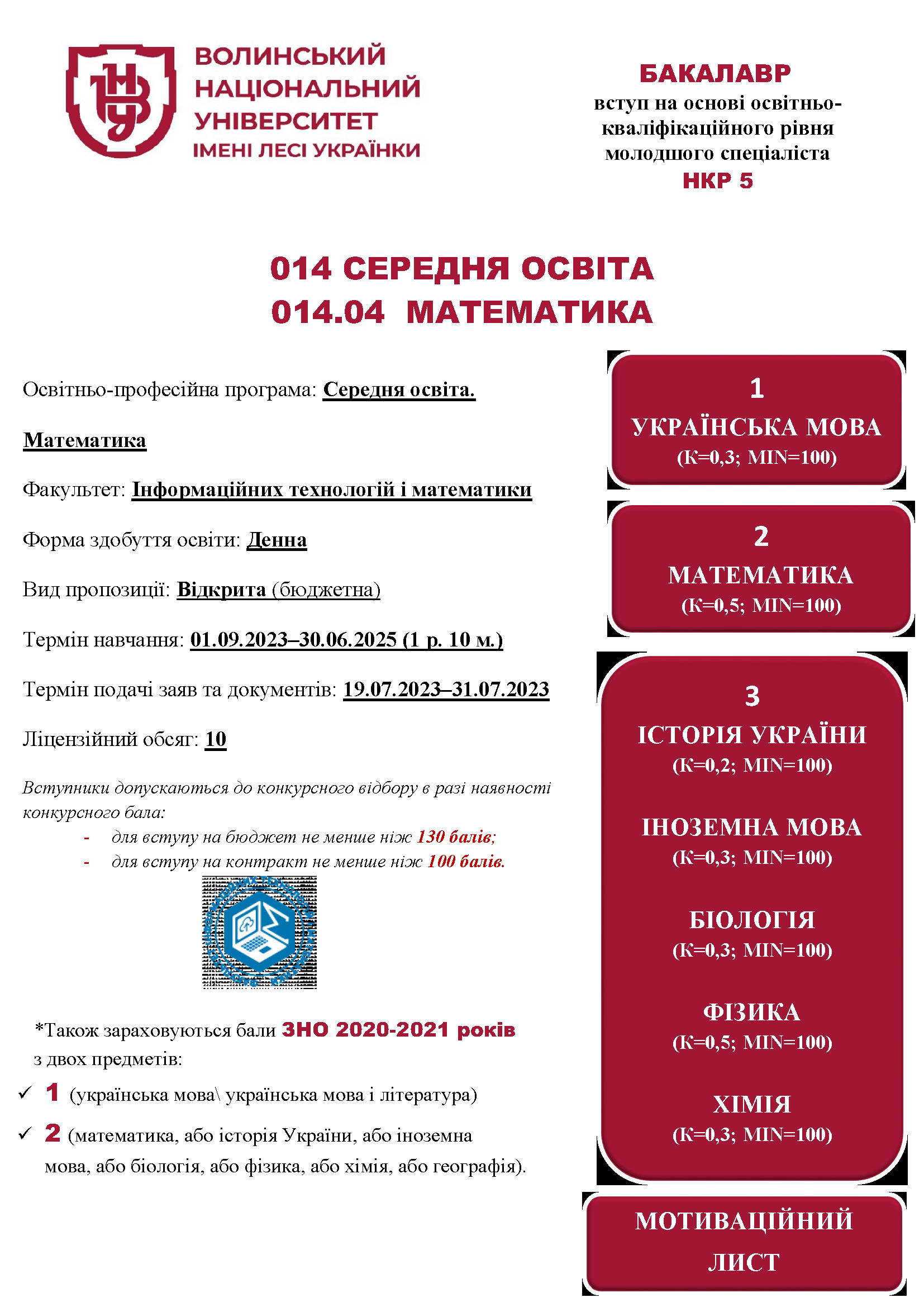 Освітня програма «Середня освіта. Математика» (денна форма здобуття освіти, вид пропозиції: відкрита/бюджетна)