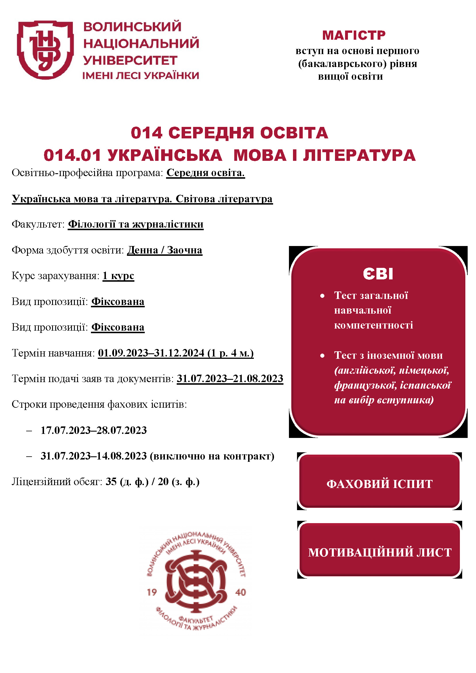 Освітня програма «Середня освіта. Українська мова та література. Світова література» (М) – Приймальна комісія Волинського національного університету імені Лесі Українки