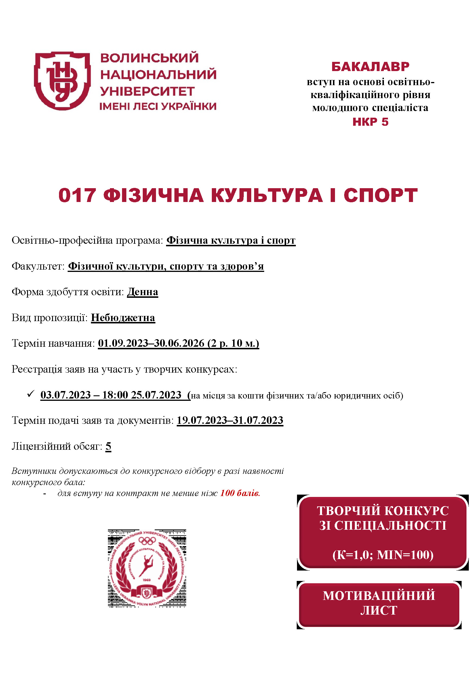 Освітня програма «Фізична культура і спорт» (денна форма здобуття освіти, вид пропозиції: небюджетна) – Приймальна комісія Волинського національного університету імені Лесі Українки