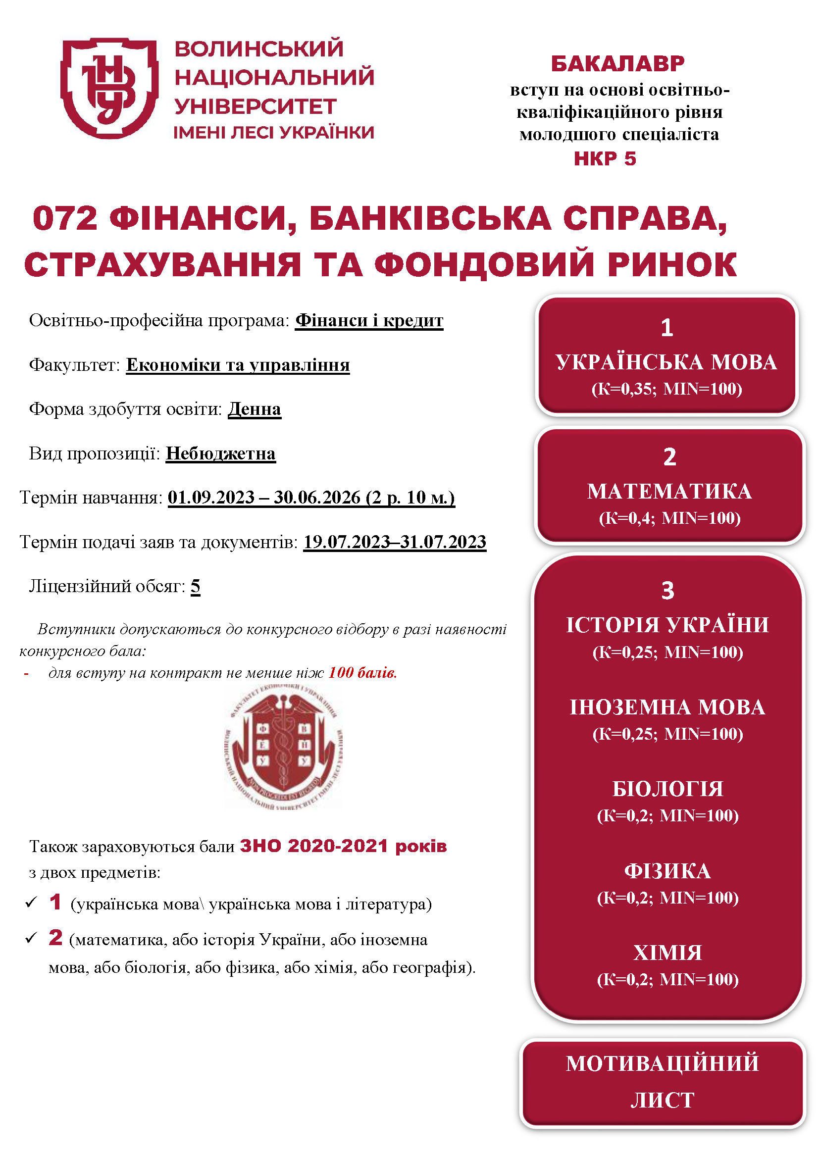 Освітня програма «Фінанси і кредит» (денна форма здобуття освіти, вид пропозиції: закрита/небюджетна)
