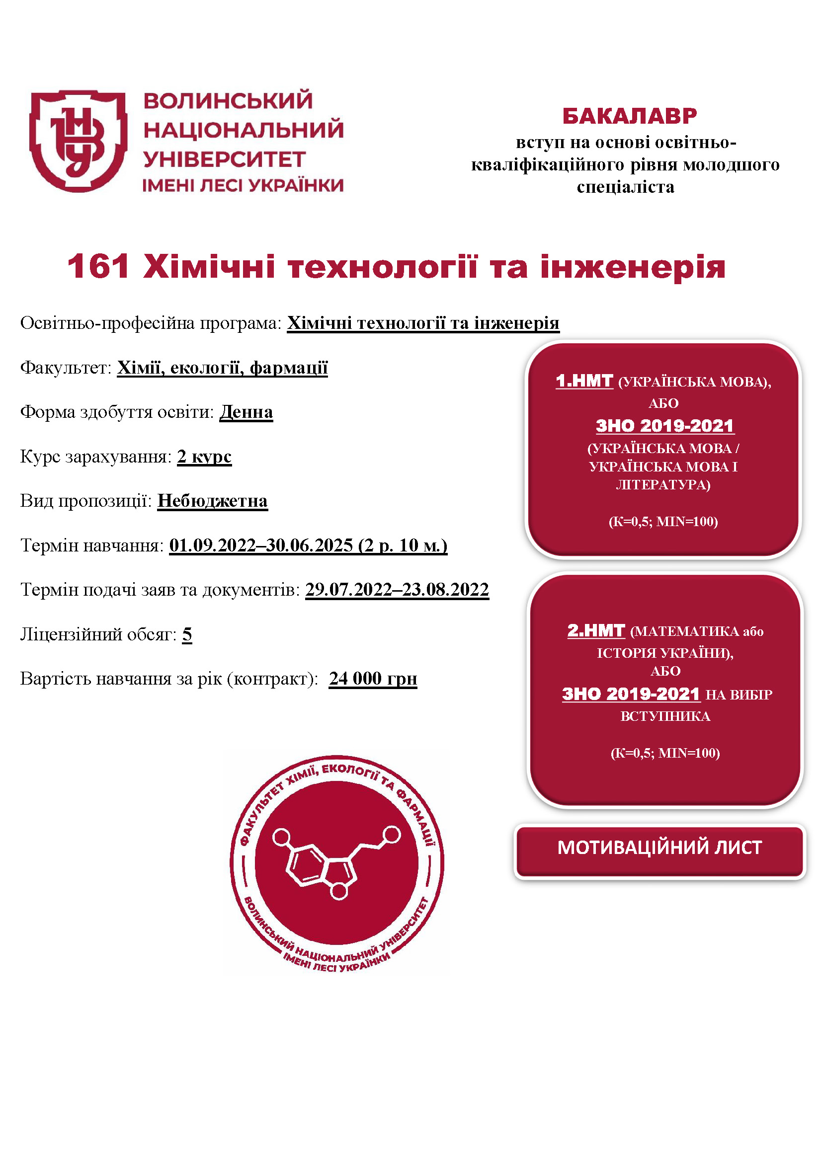 Освітня програма «Хімічні технології та інженерія» (МС, 2-й курс, денна форма здобуття освіти)
