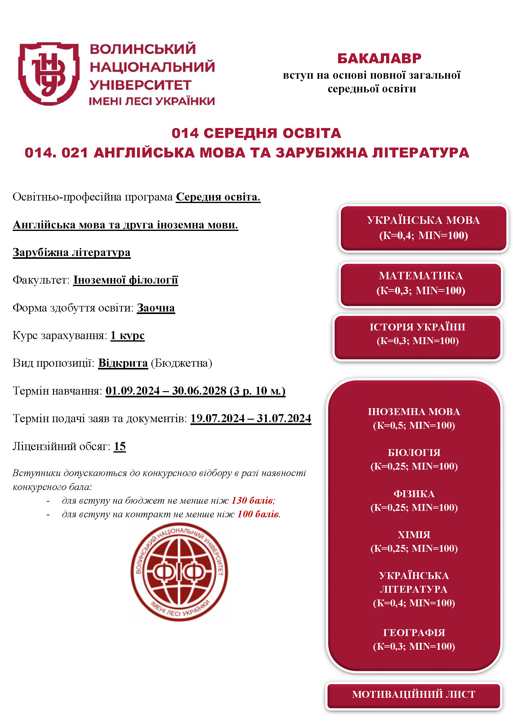 Середня освіта. Англійська мова та друга іноземна мови. Зарубіжна література (заочна форма здобуття освіти)