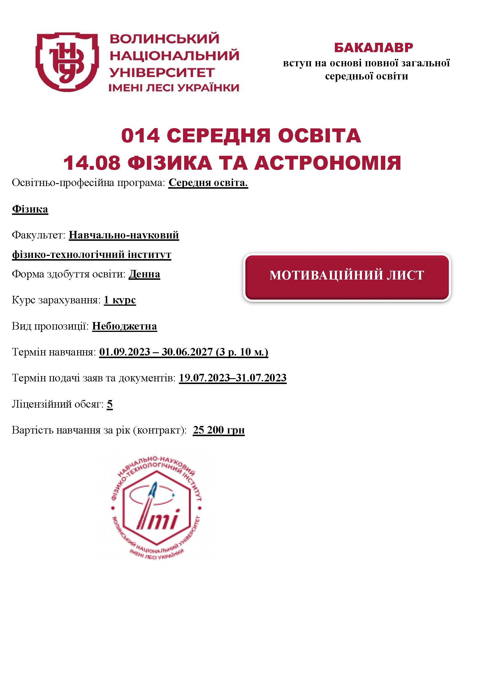 Середня освіта. Фізика (денна форма здобуття освіти, вид пропозиції: небюджетна)