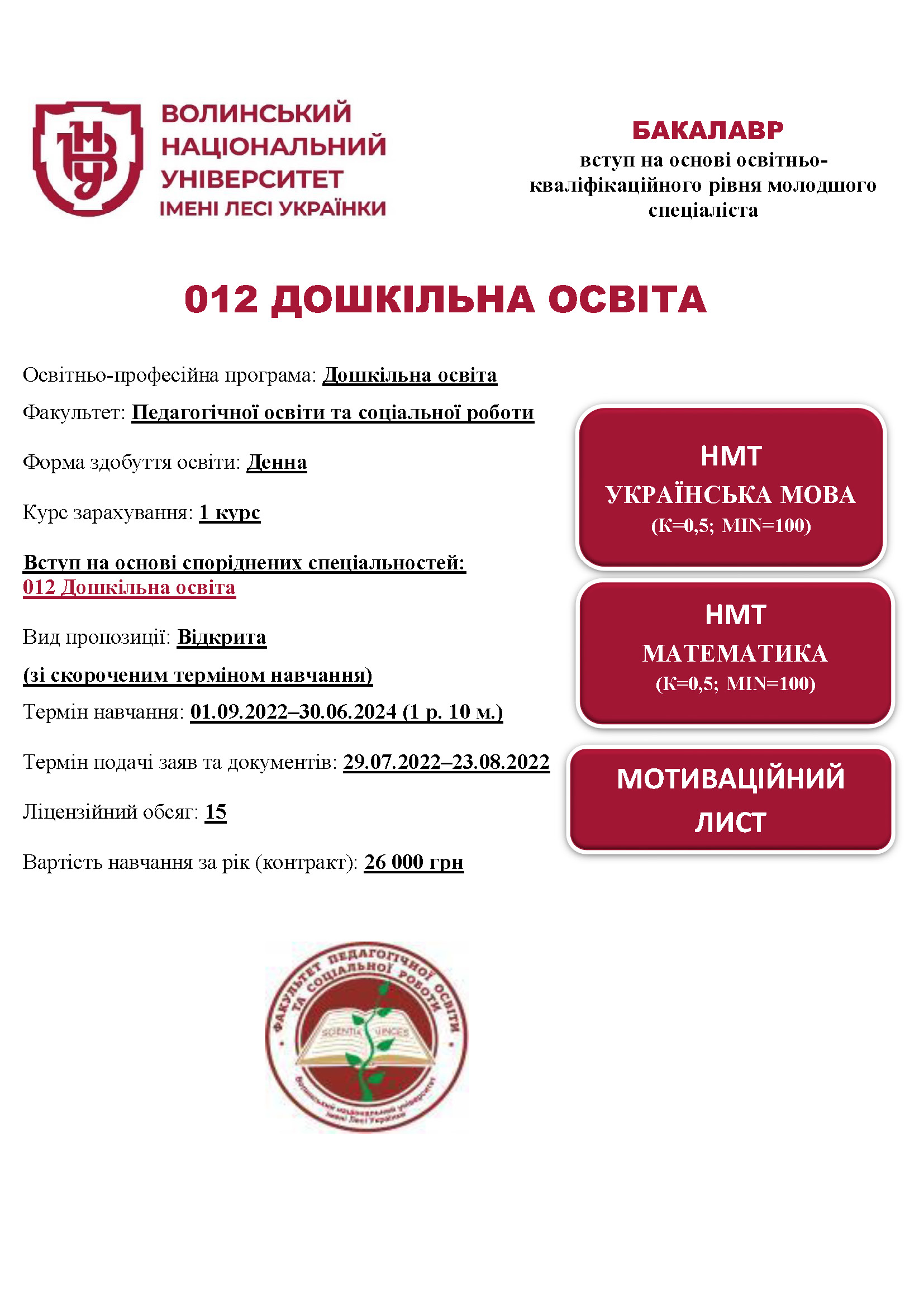 СПЕЦІАЛЬНІСТЬ 012 ДОШКІЛЬНА ОСВІТА, освітня програма «Дошкільна освіта» (МС, денна форма здобуття освіти)