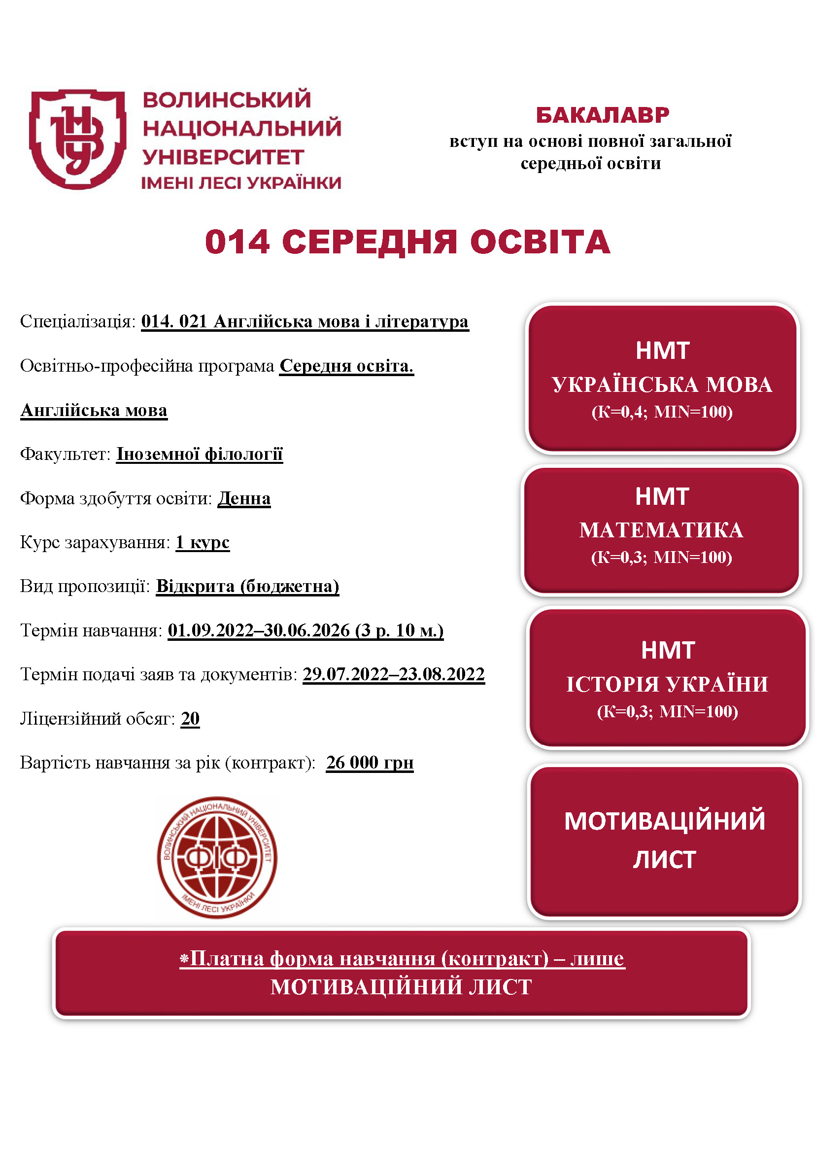 Спеціальність 014 СЕРЕДНЯ ОСВІТА (АНГЛІЙСЬКА МОВА І ЛІТЕРАТУРА, освітня програма «Середня освіта. Англійська мова»