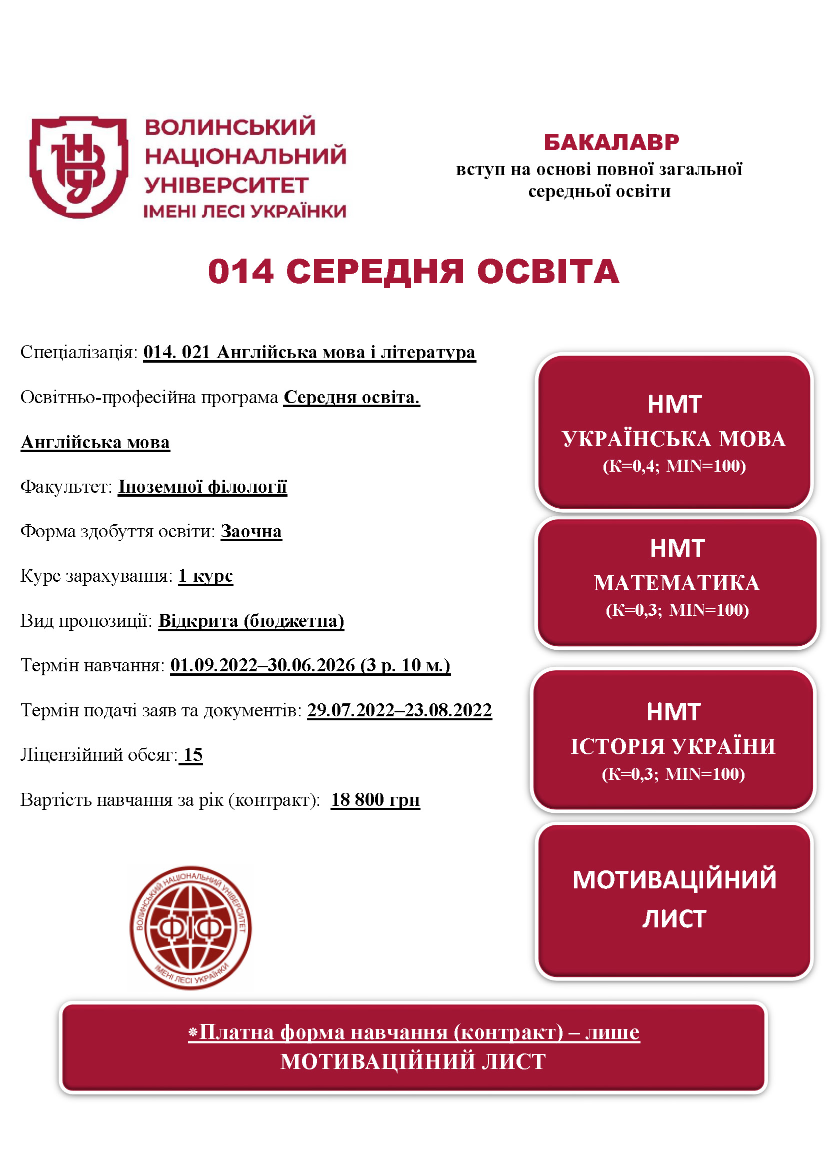 Спеціальність 014 СЕРЕДНЯ ОСВІТА (АНГЛІЙСЬКА МОВА І ЛІТЕРАТУРА, освітня програма «Середня освіта. Англійська мова» (заочна форма здобуття освіти)