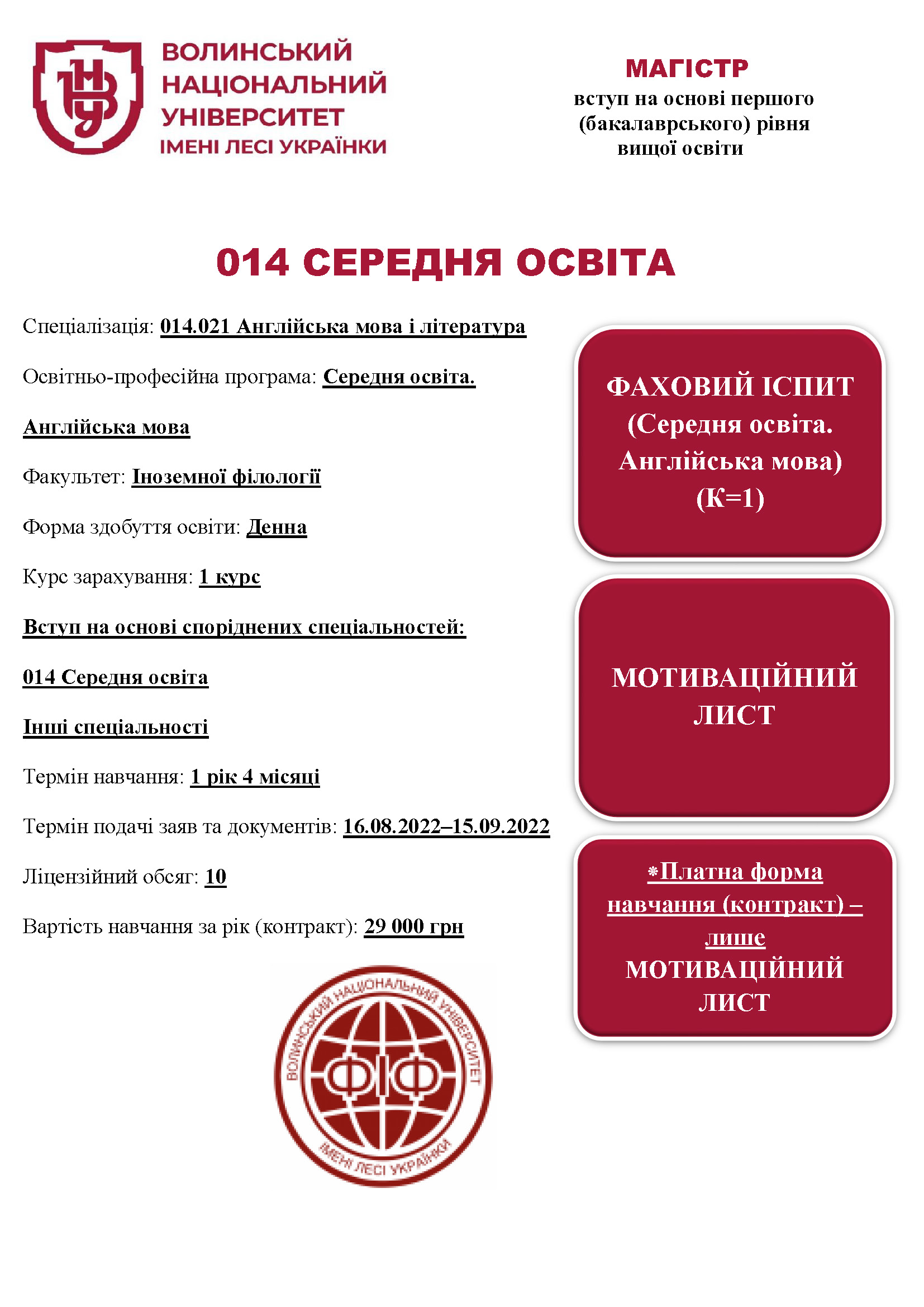 Спеціальність 014 СЕРЕДНЯ ОСВІТА (АНГЛІЙСЬКА МОВА І ЛІТЕРАТУРА, освітня програма «Середня освіта. Англійська мова» (денна форма здобуття освіти)