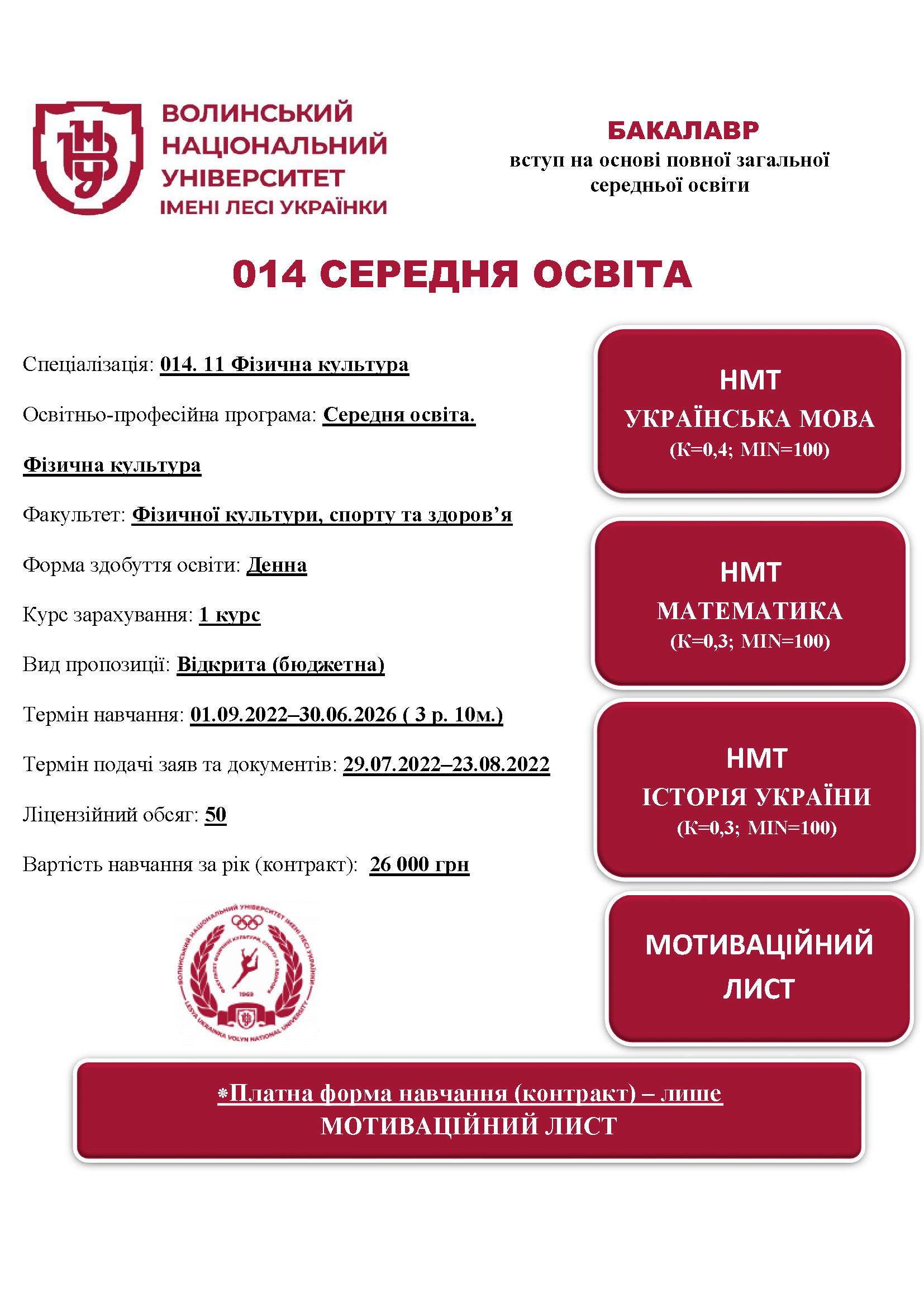 Спеціальність 014 СЕРЕДНЯ ОСВІТА (ФІЗИЧНА КУЛЬТУРА), освітня програма «Середня освіта. Фізична культура»