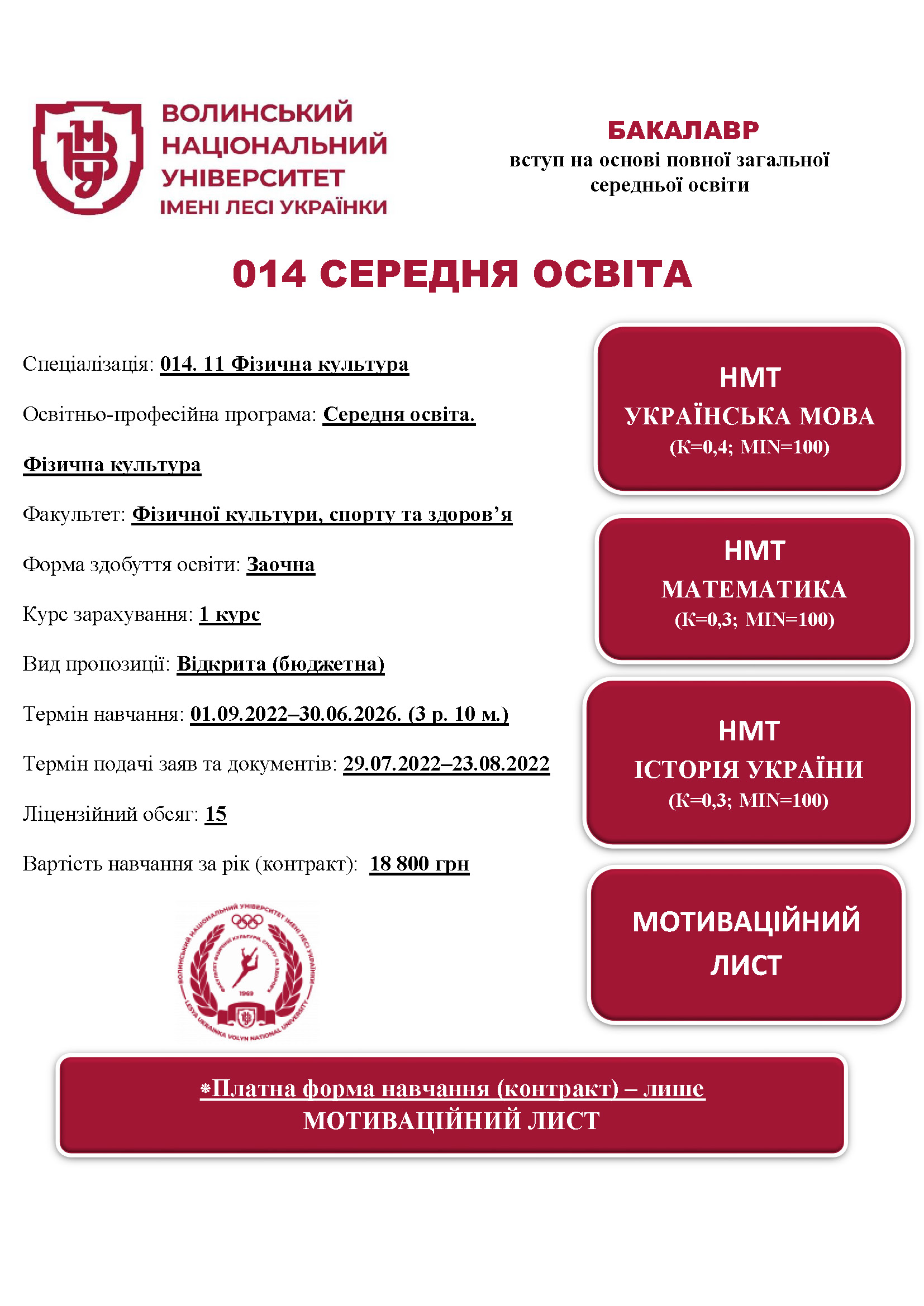 Спеціальність 014 СЕРЕДНЯ ОСВІТА (ФІЗИЧНА КУЛЬТУРА), освітня програма «Середня освіта. Фізична культура» (заочна форма здобуття освіти) – Приймальна комісія Волинського національного університету імені Лесі Українки