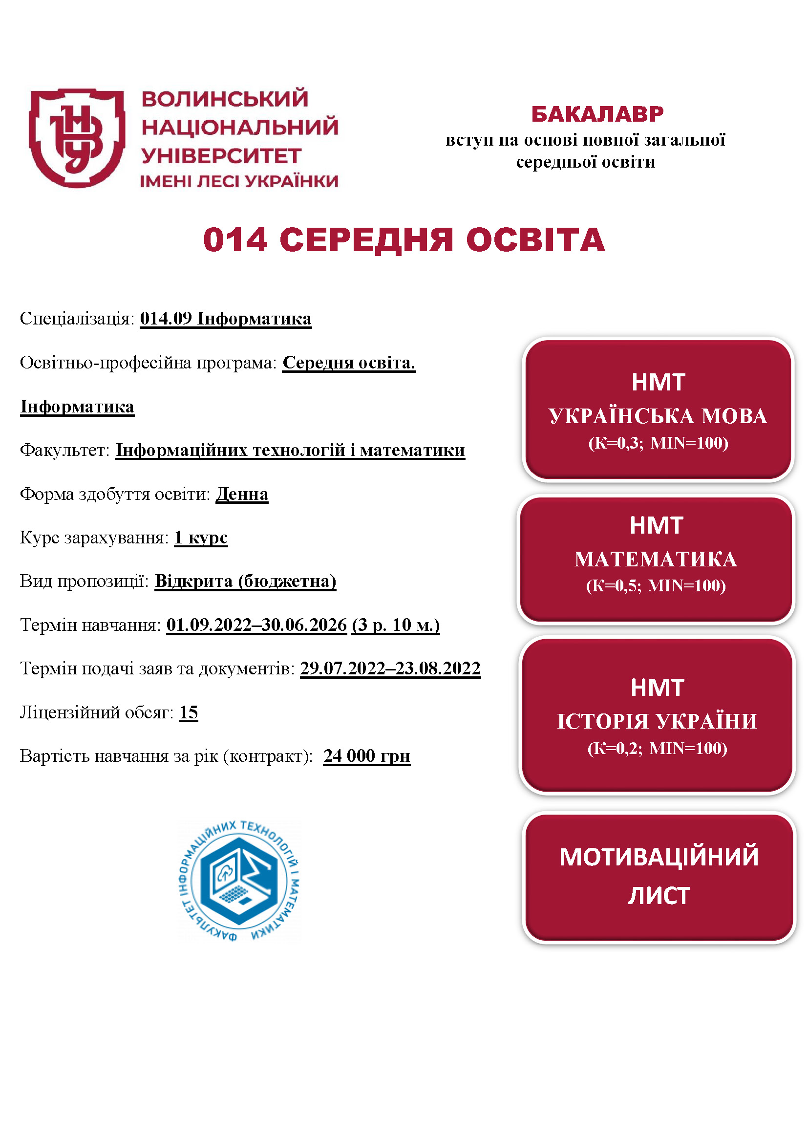 Спеціальність 014 СЕРЕДНЯ ОСВІТА (ІНФОРМАТИКА), освітня програма «Середня освіта. Інформатика»