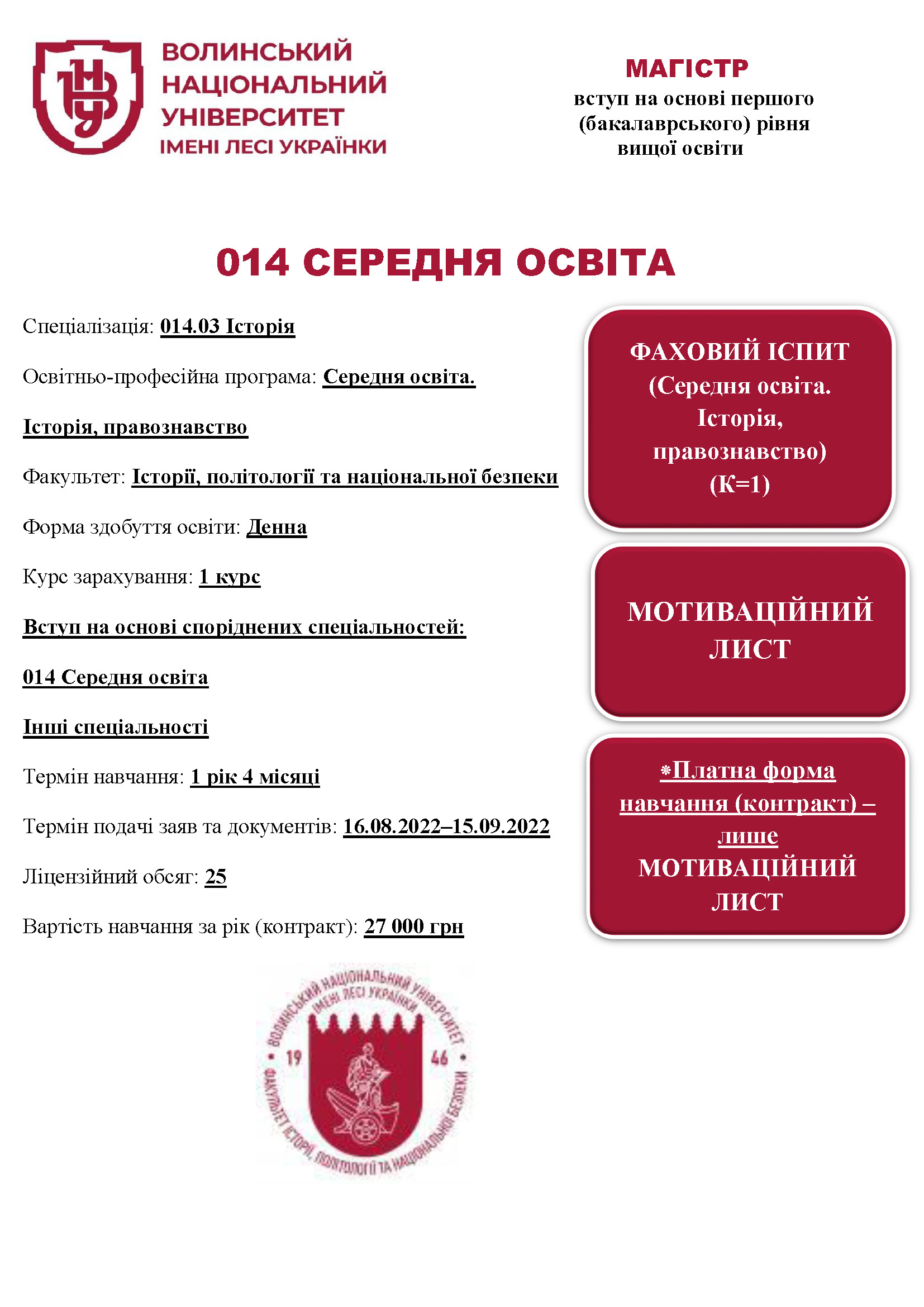 СПЕЦІАЛЬНІСТЬ 014 СЕРЕДНЯ ОСВІТА (ІСТОРІЯ), освітня програма «Середня освіта. Історія, правознавство» (денна форма здобуття освіти)