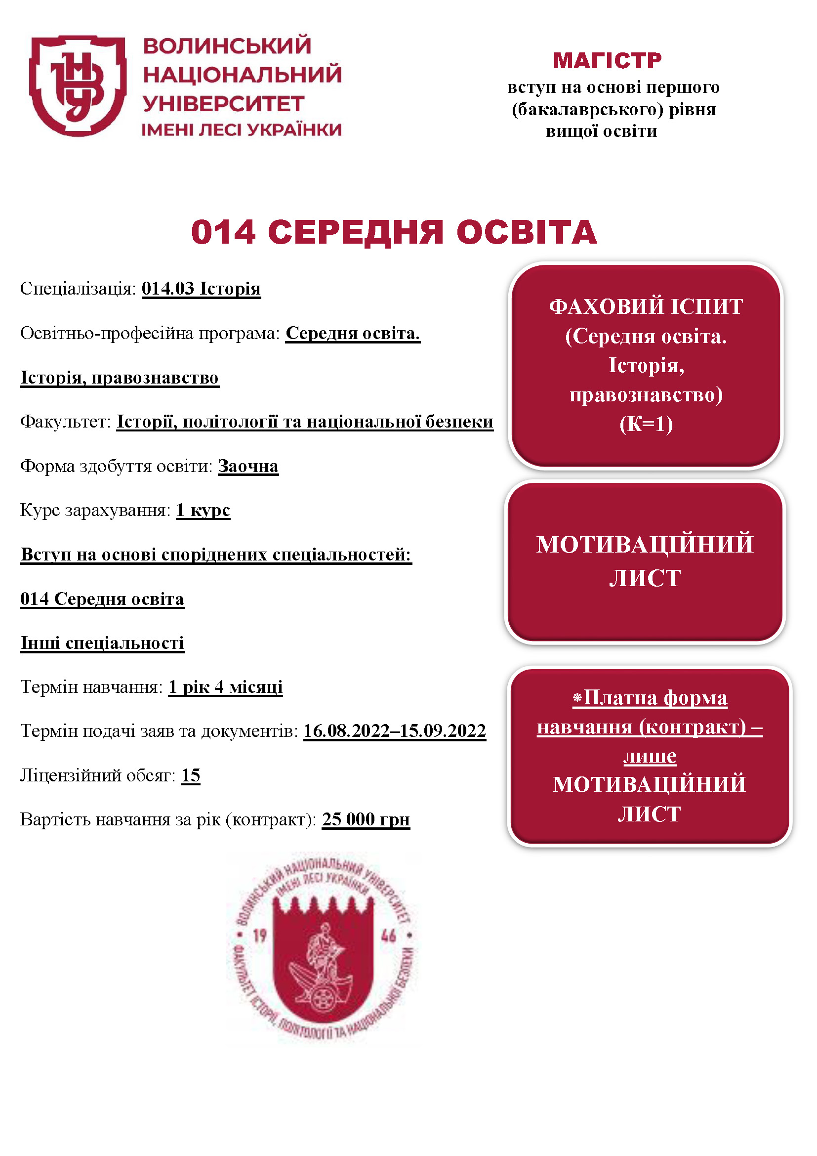 СПЕЦІАЛЬНІСТЬ 014 СЕРЕДНЯ ОСВІТА (ІСТОРІЯ), освітня програма «Середня освіта. Історія, правознавство» (заочна форма здобуття освіти)