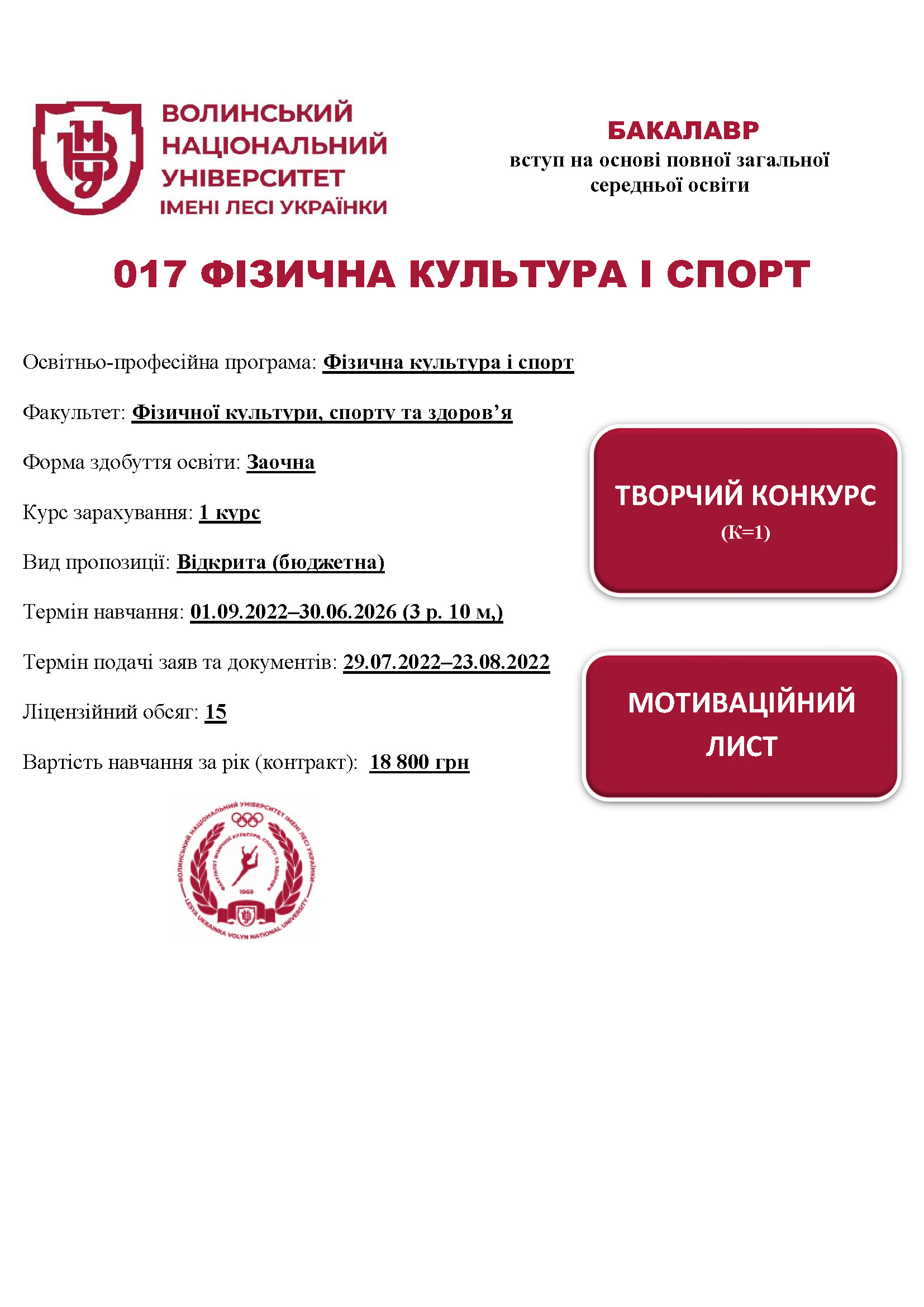 Спеціальність 017 ФІЗИЧНА КУЛЬТУРА І СПОРТ, освітня програма «Фізична культура і спорт» (заочна форма здобуття освіти)