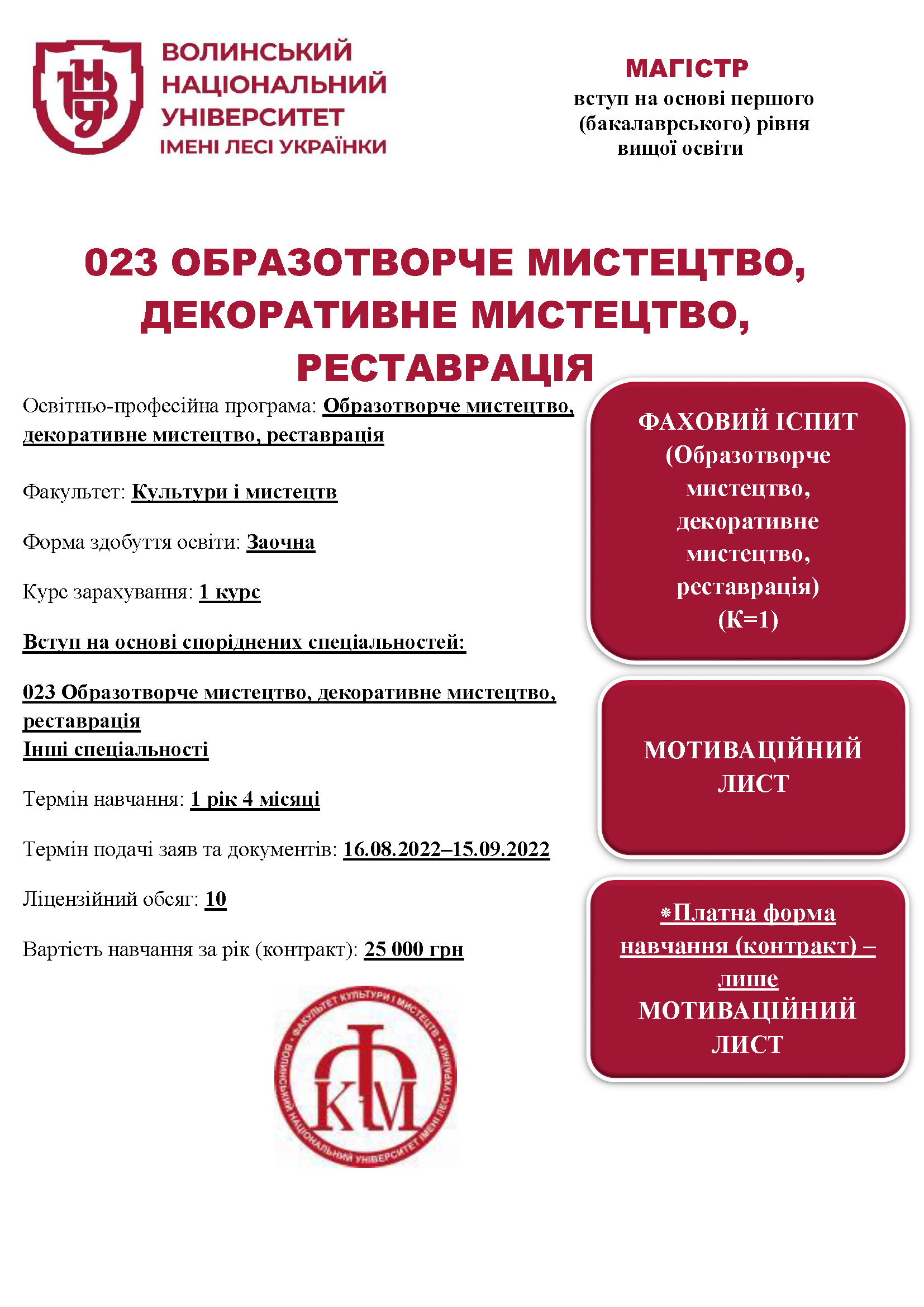 СПЕЦІАЛЬНІСТЬ 023 ОБРАЗОТВОРЧЕ МИСТЕЦТВО, ДЕКОРАТИВНЕ МИСТЕЦТВО, РЕСТАВРАЦІЯ, освітня програма «Образотворче мистецтво, декоративне мистецтво, реставрація» (заочна форма здобуття освіти)