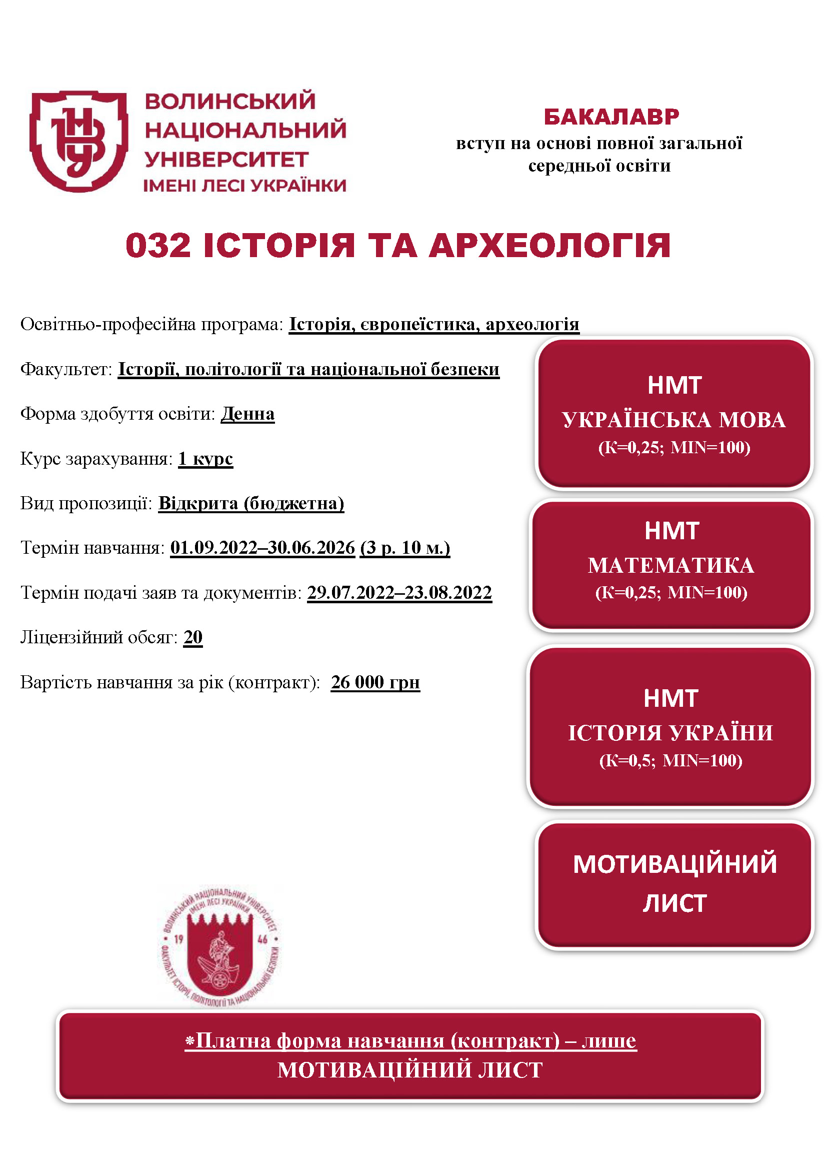 СПЕЦІАЛЬНІСТЬ 032 ІСТОРІЯ ТА АРХЕОЛОГІЯ, освітня програма «Історія, європеїстика, археологія»