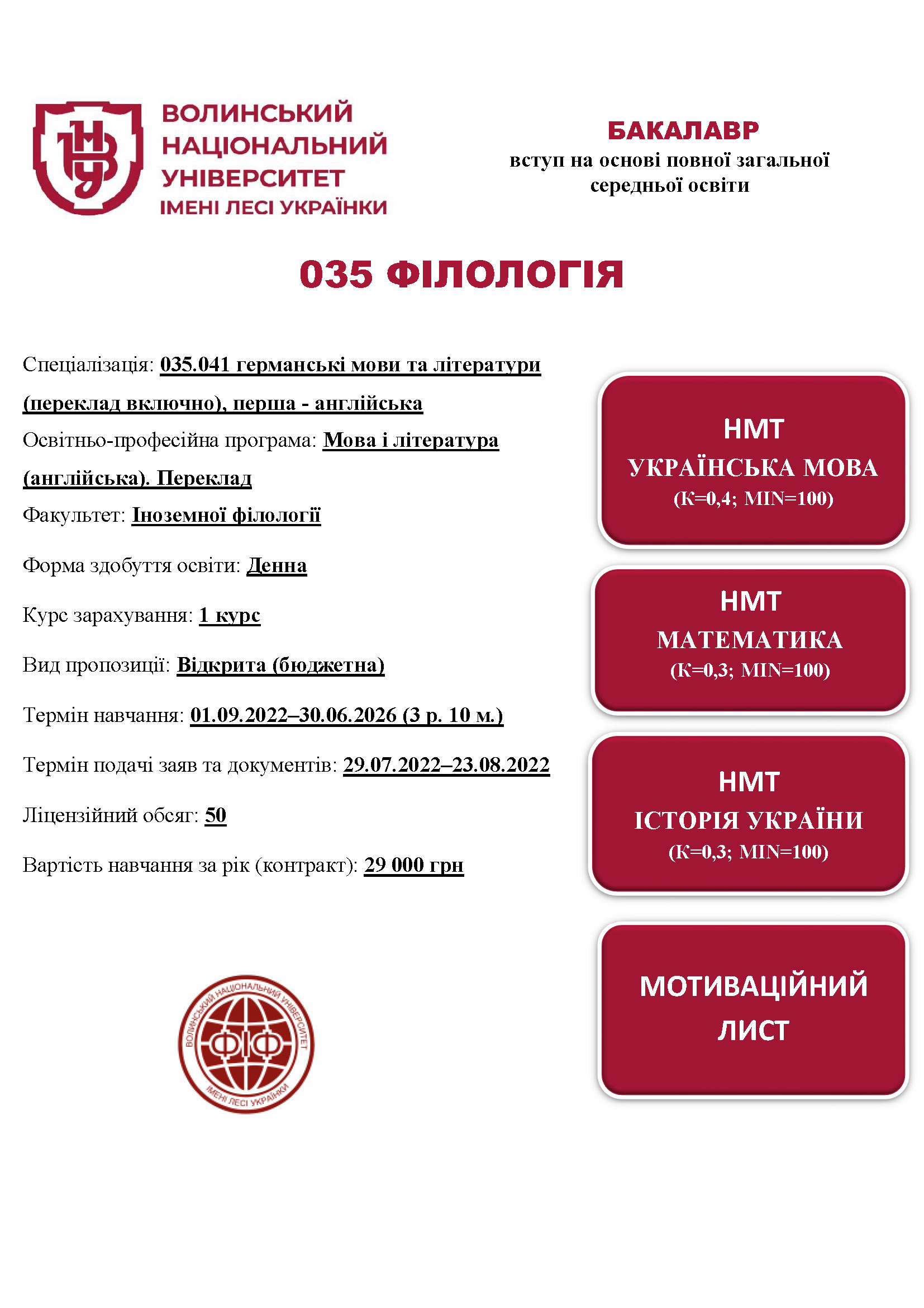 Спеціальність 035 ФІЛОЛОГІЯ (ГЕРМАНСЬКІ МОВИ ТА ЛІТЕРАТУРИ (ПЕРЕКЛАД ВКЛЮЧНО), ПЕРША – АНГЛІЙСЬКА), освітня програма «Мова і література (англійська). Переклад»