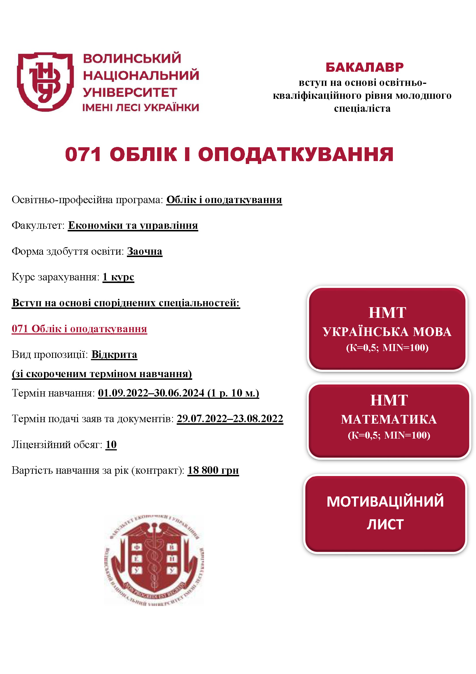 Спеціальність 071 ОБЛІК І ОПОДАТКУВАННЯ, освітня програма «Облік і оподаткування» (МС, заочна форма здобуття освіти)
