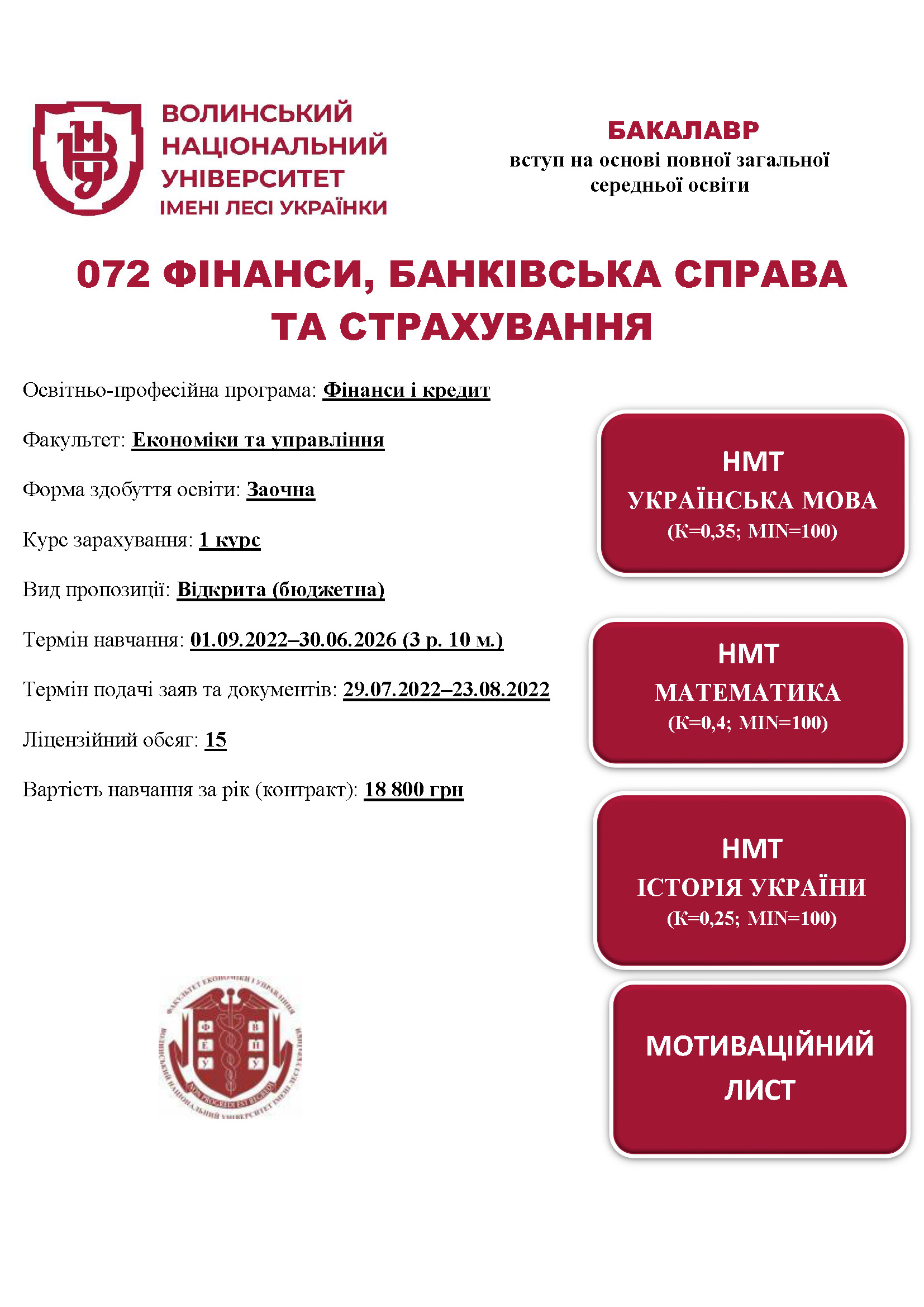 Спеціальність 072 ФІНАНСИ, БАНКІВСЬКА СПРАВА ТА СТРАХУВАННЯ, освітня програма «Фінанси і кредит» (заочна форма здобуття освіти) – Приймальна комісія Волинського національного університету імені Лесі Українки