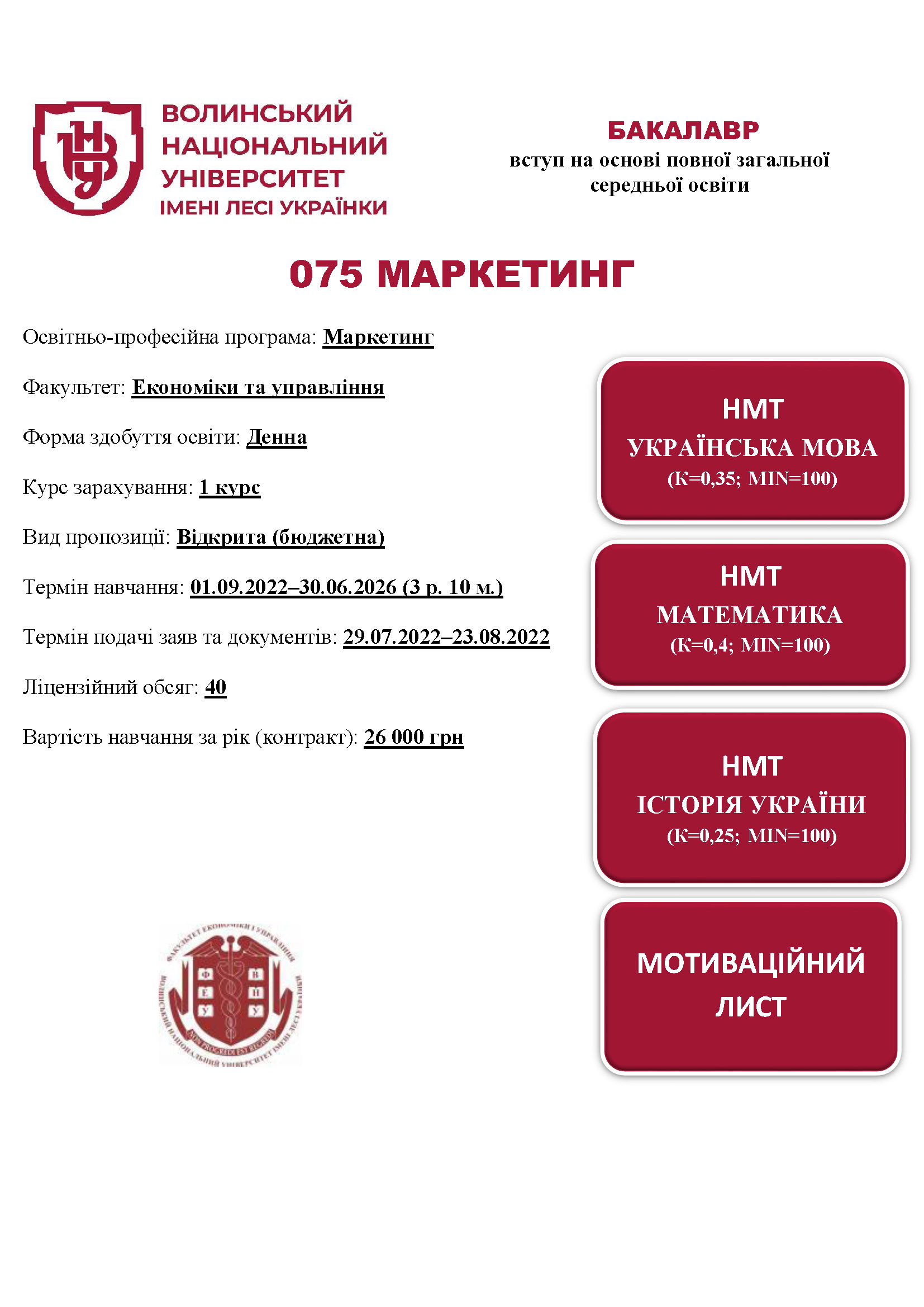 Спеціальність 075 МАРКЕТИНГ, освітня програма «Маркетинг» – Приймальна комісія Волинського національного університету імені Лесі Українки