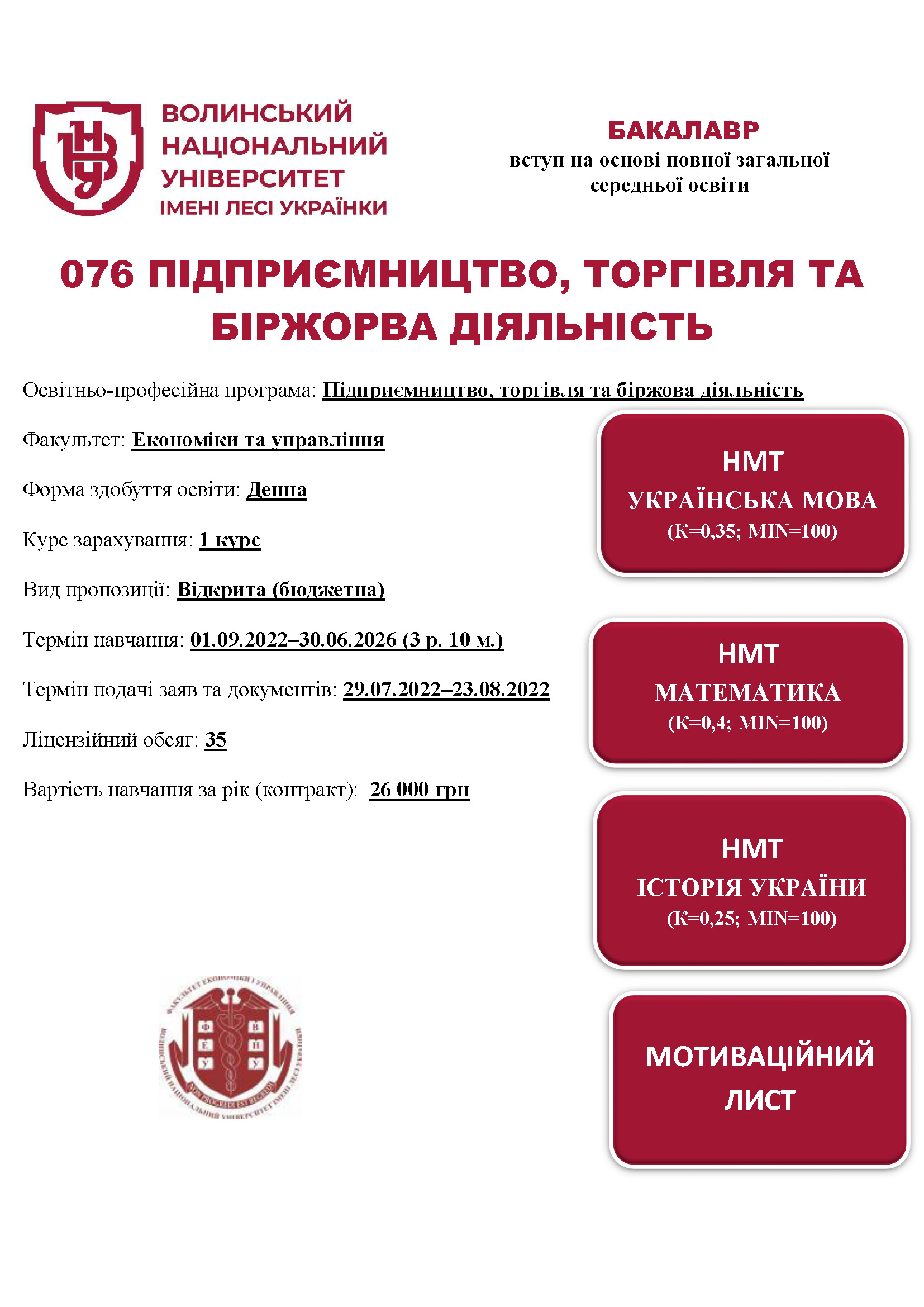 Спеціальність 076 ПІДПРИЄМНИЦТВО, ТОРГІВЛЯ ТА БІРЖОВА ДІЯЛЬНІСТЬ, освітня програма «Підприємництво, торгівля та біржова діяльність»
