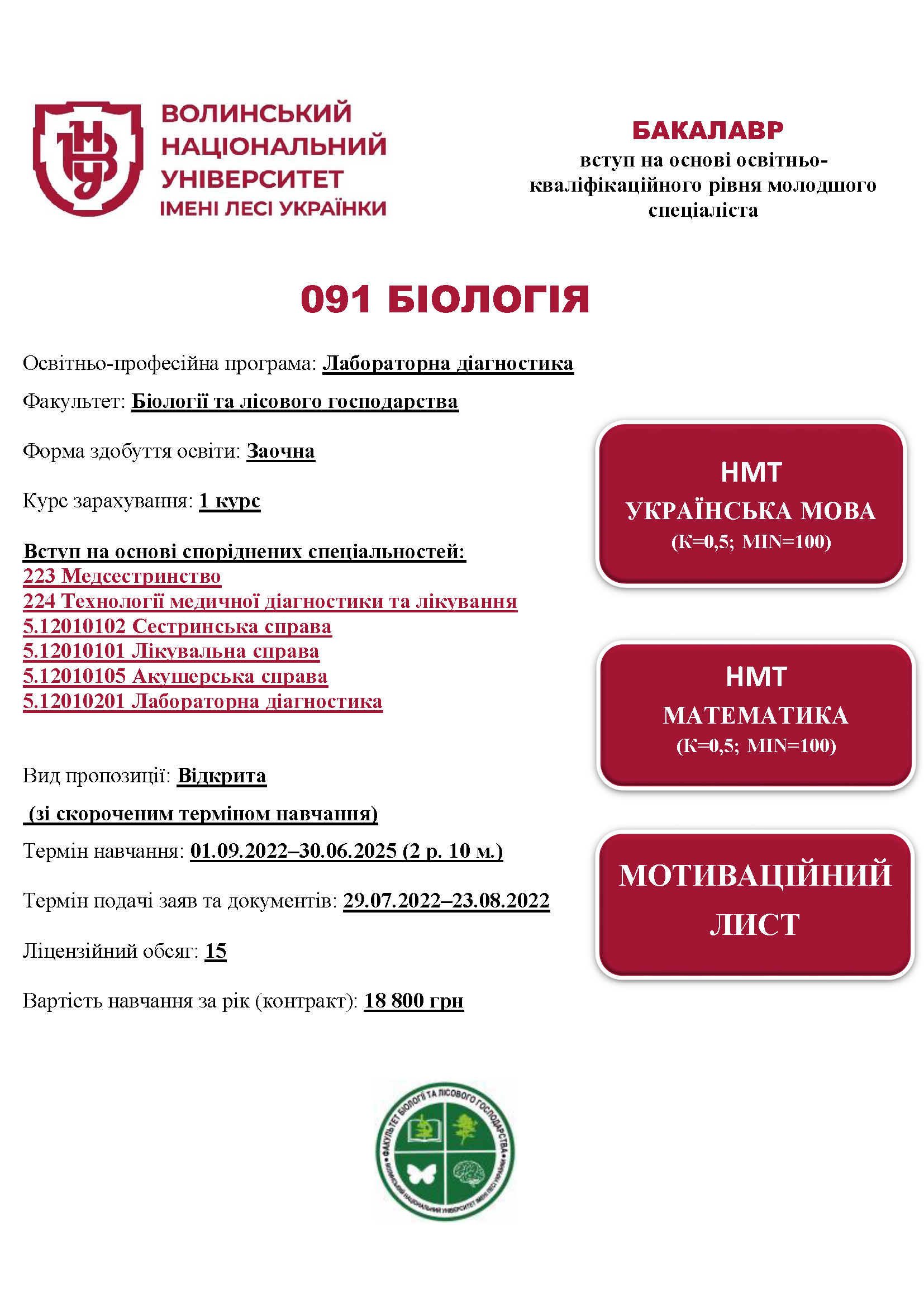 Спеціальність 091 БІОЛОГІЯ, освітня програма: Лабораторна діагностика (МС, заочна форма здобуття освіти) – Приймальна комісія Волинського національного університету імені Лесі Українки