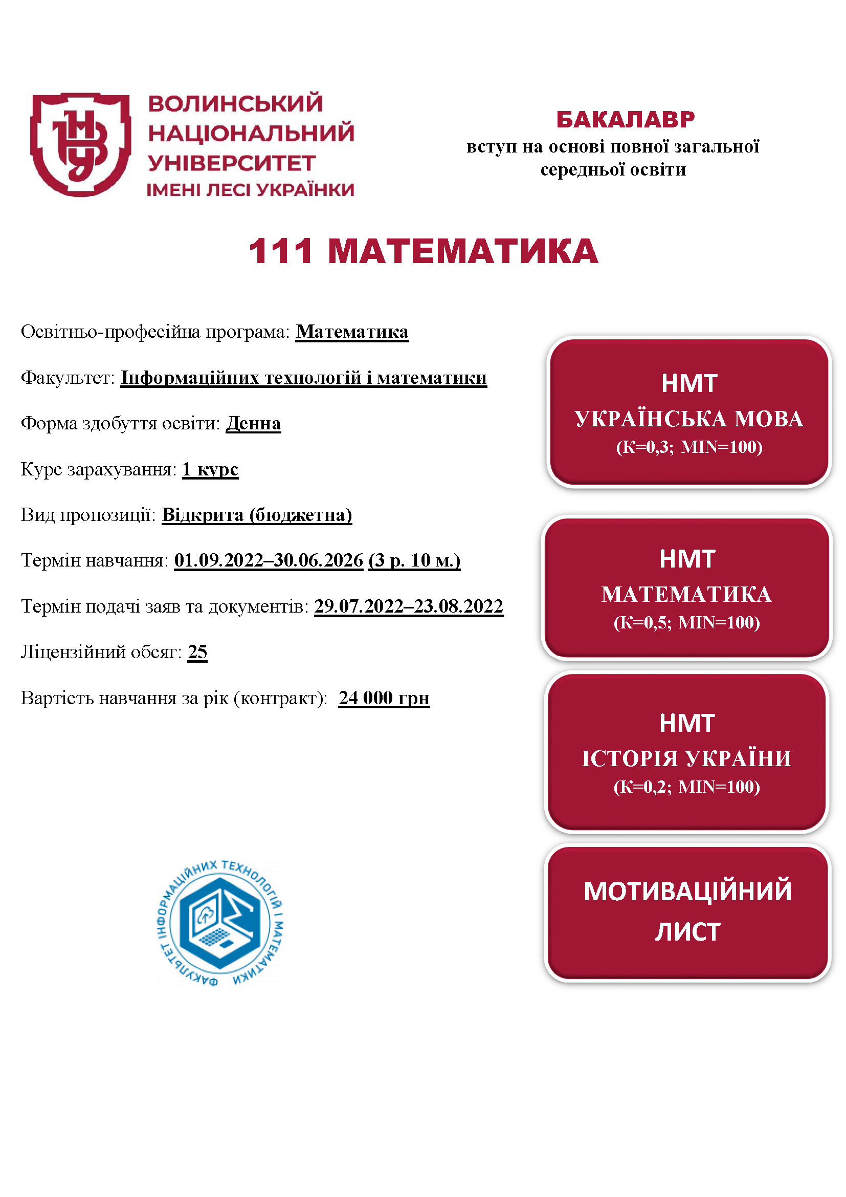 Спеціальність 111 МАТЕМАТИКА, освітня програма «Математика» – Приймальна комісія Волинського національного університету імені Лесі Українки