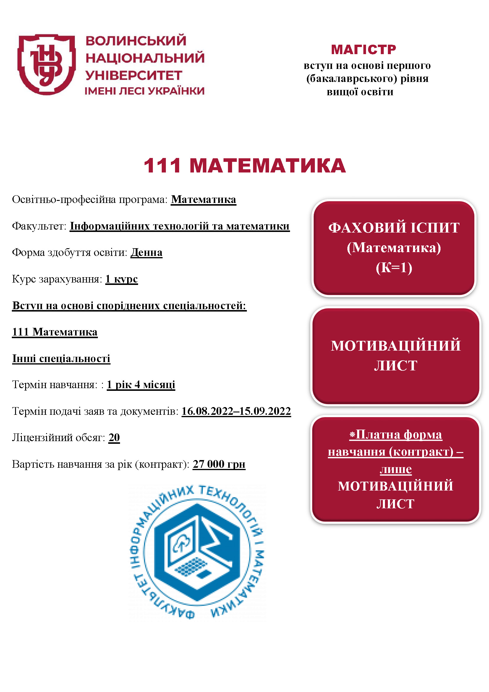 Спеціальність 111 МАТЕМАТИКА, освітня програма «Математика» (денна форма здобуття освіти)