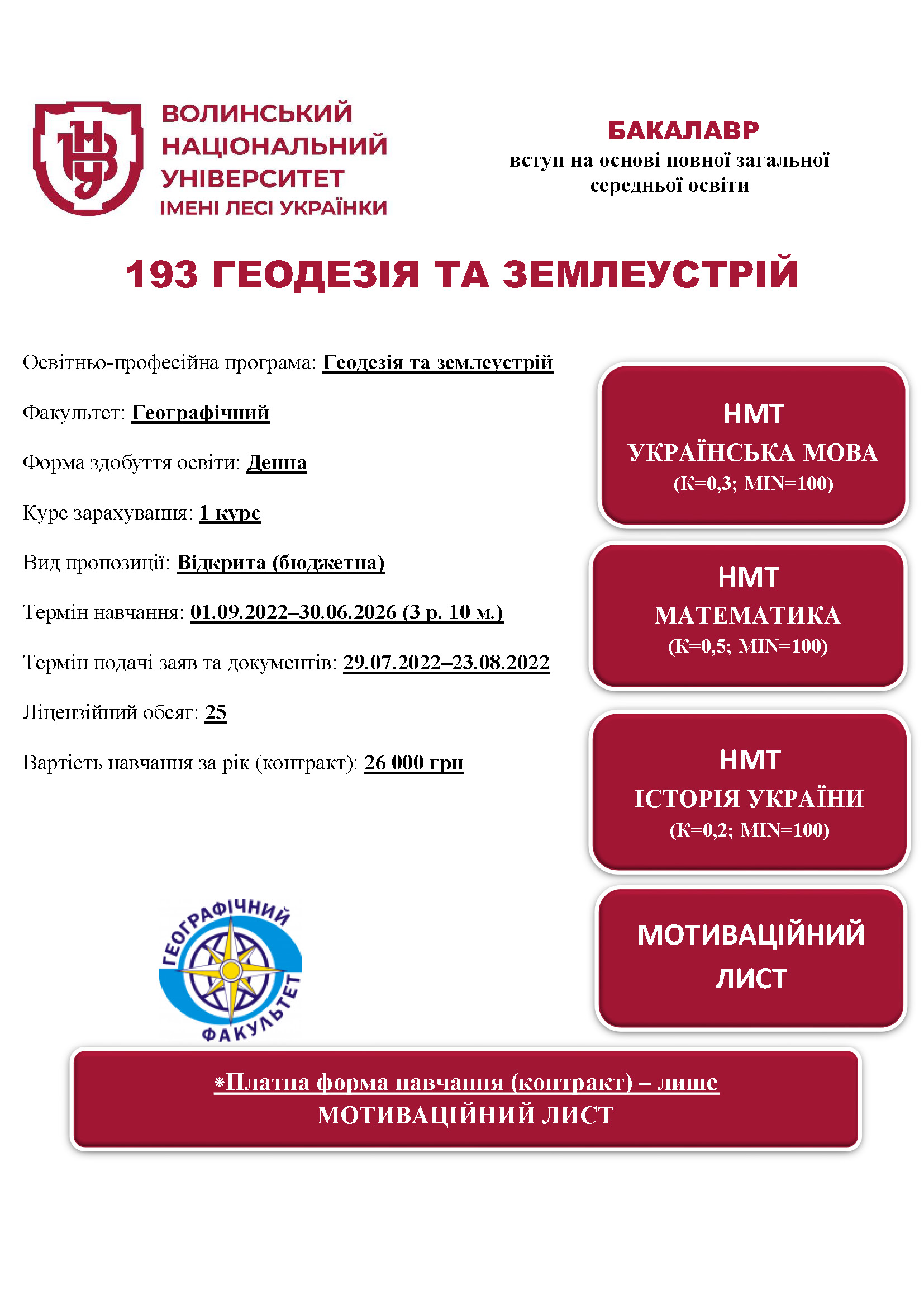 Спеціальність 193 ГЕОДЕЗІЯ ТА ЗЕМЛЕУСТРІЙ, освітня програма «Геодезія та землеустрій»