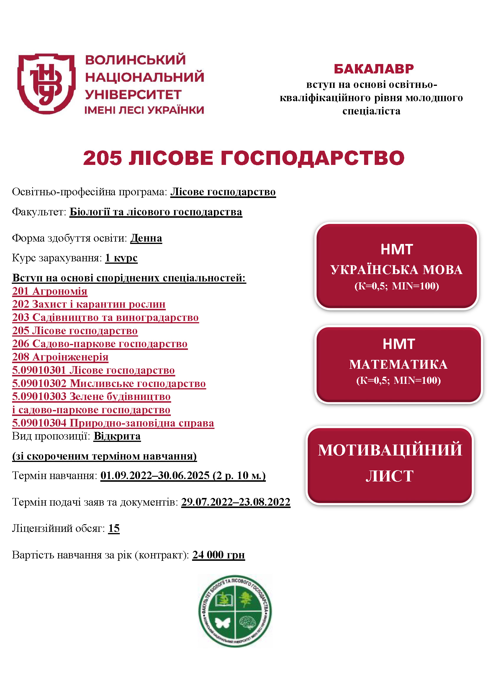 Спеціальність 205 ЛІСОВЕ ГОСПОДАРСТВО, освітня програма «Лісове господарство» (МС, денна форма здобуття освіти)