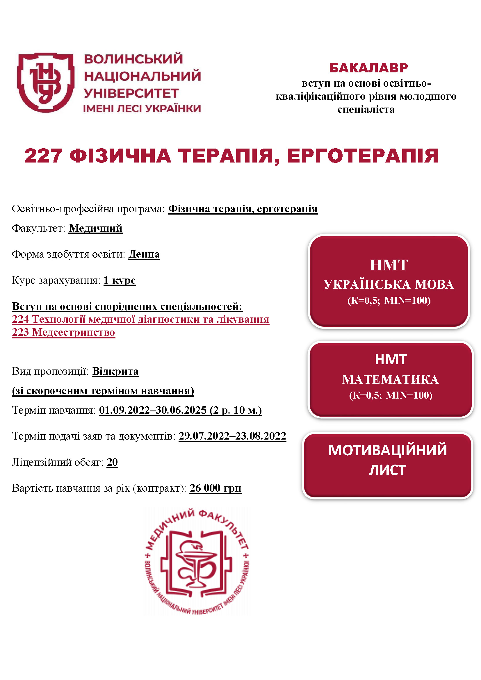 Спеціальність 227 ФІЗИЧНА ТЕРАПІЯ, ЕРГОТЕРАПІЯ, освітня програма «Фізична терапія, ерготерапія» (МС)