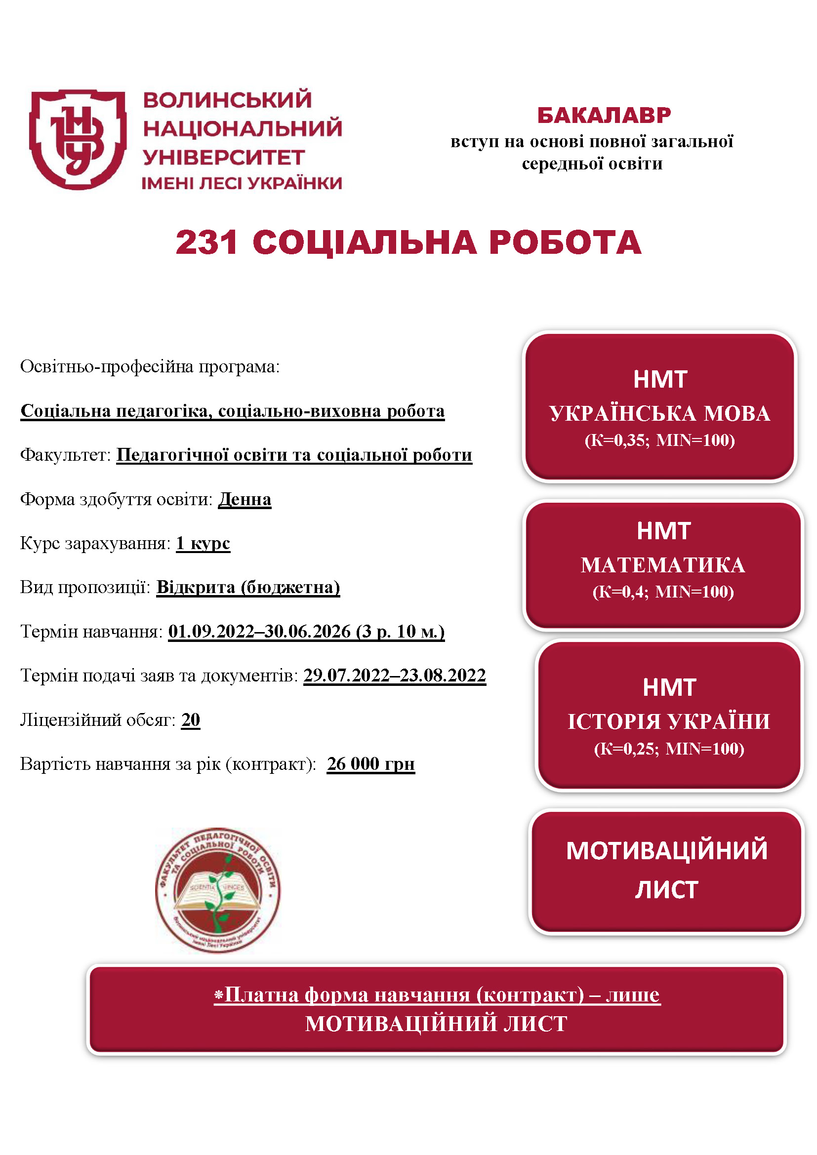 СПЕЦІАЛЬНІСТЬ 231 СОЦІАЛЬНА РОБОТА, освітня програма «Соціальна педагогіка, соціально-виховна робота»