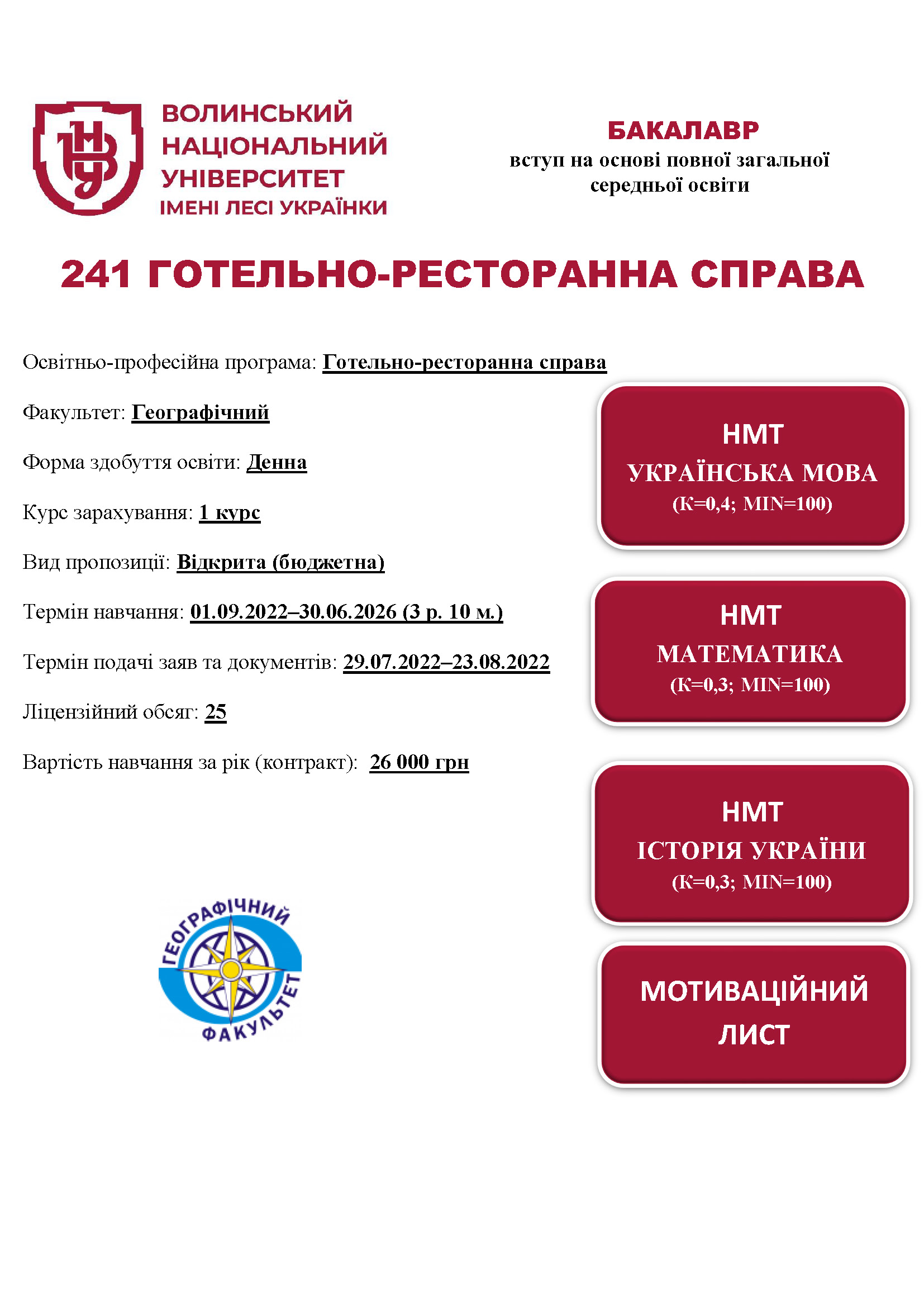 Спеціальність 241 ГОТЕЛЬНО-РЕСТОРАННА СПРАВА, освітня програма «Готельно-ресторанна справа»