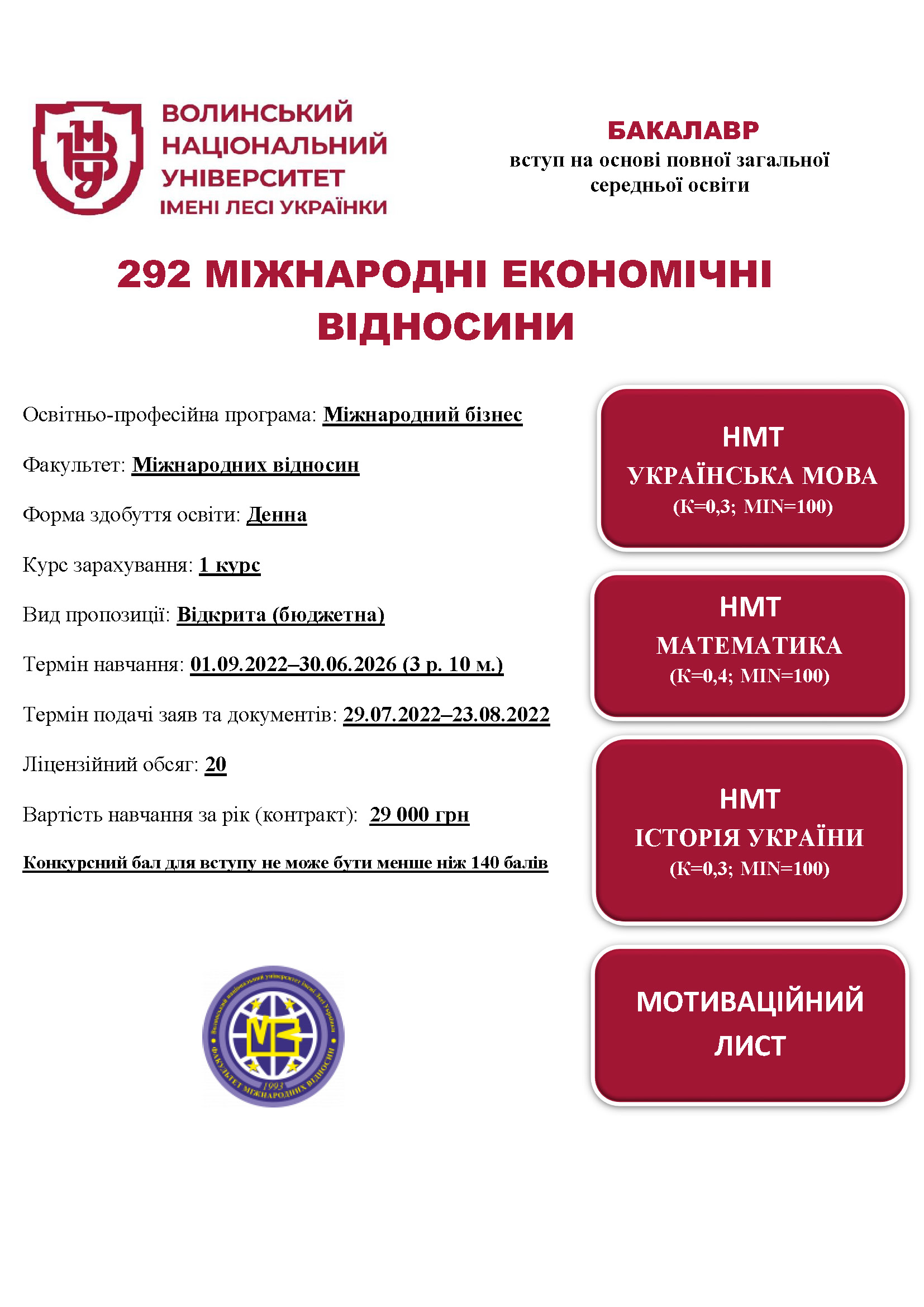 СПЕЦІАЛЬНІСТЬ 292 МІЖНАРОДНІ ЕКОНОМІЧНІ ВІДНОСИНИ, освітня програма «Міжнародний бізнес» – Приймальна комісія Волинського національного університету імені Лесі Українки