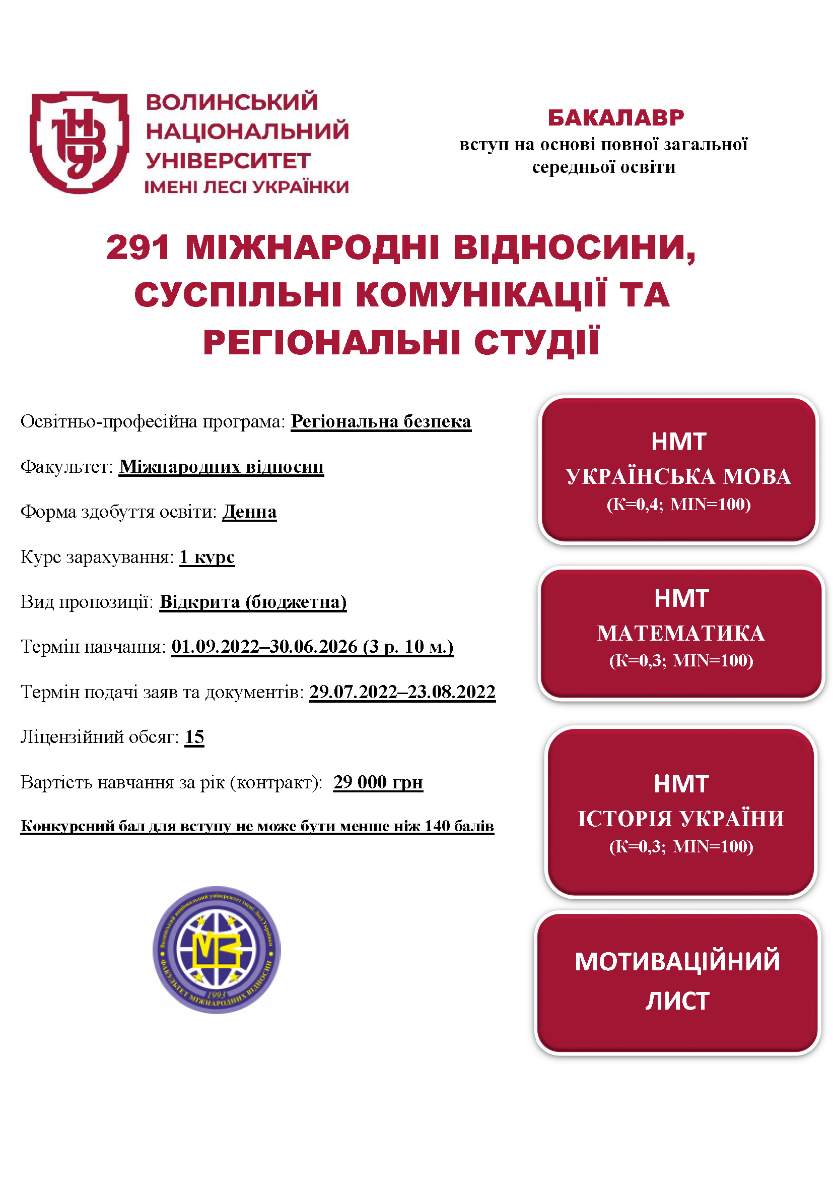 291 МІЖНАРОДНІ ВІДНОСИНИ, СУСПІЛЬНІ КОМУНІКАЦІЇ ТА РЕГІОНАЛЬНІ СТУДІЇ, освітня програма «Регіональна безпека» – Приймальна комісія Волинського національного університету імені Лесі Українки