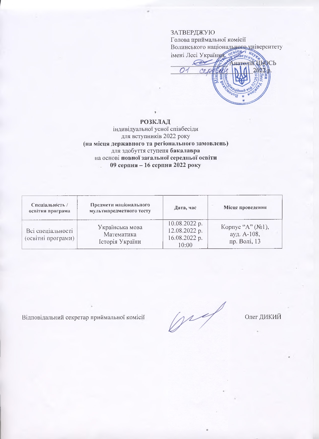 Розклад індивідуальної усної співбесіди для вступників 2022 року